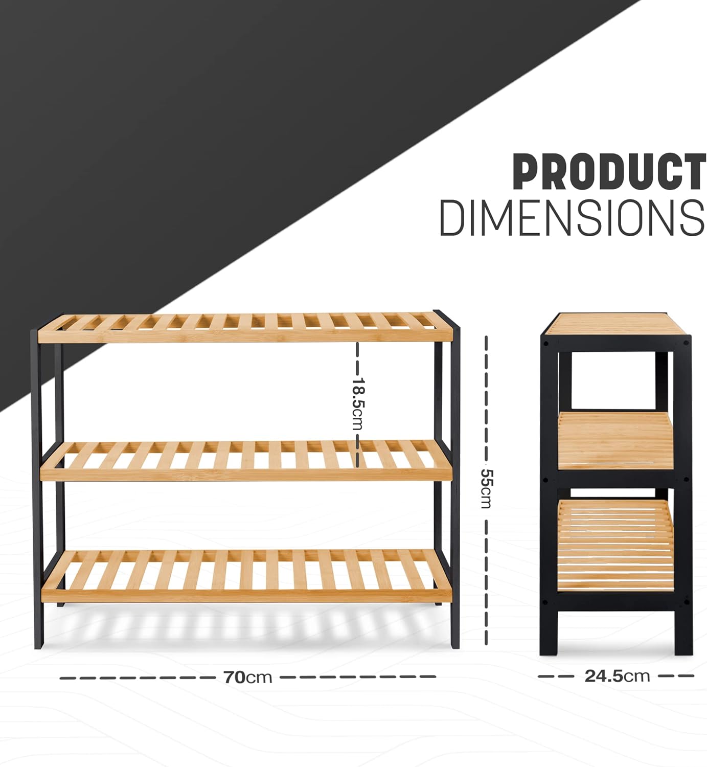The rack measures 55x70x55 cm with three spacious tiers, this shoe rack can comfortably hold up to 12 pairs of shoes, allowing you to keep your footwear organized. The compact size of this shoe rack makes it easy to store in small spaces, such as closets or entryways, helping you to utilize your space more efficiently.