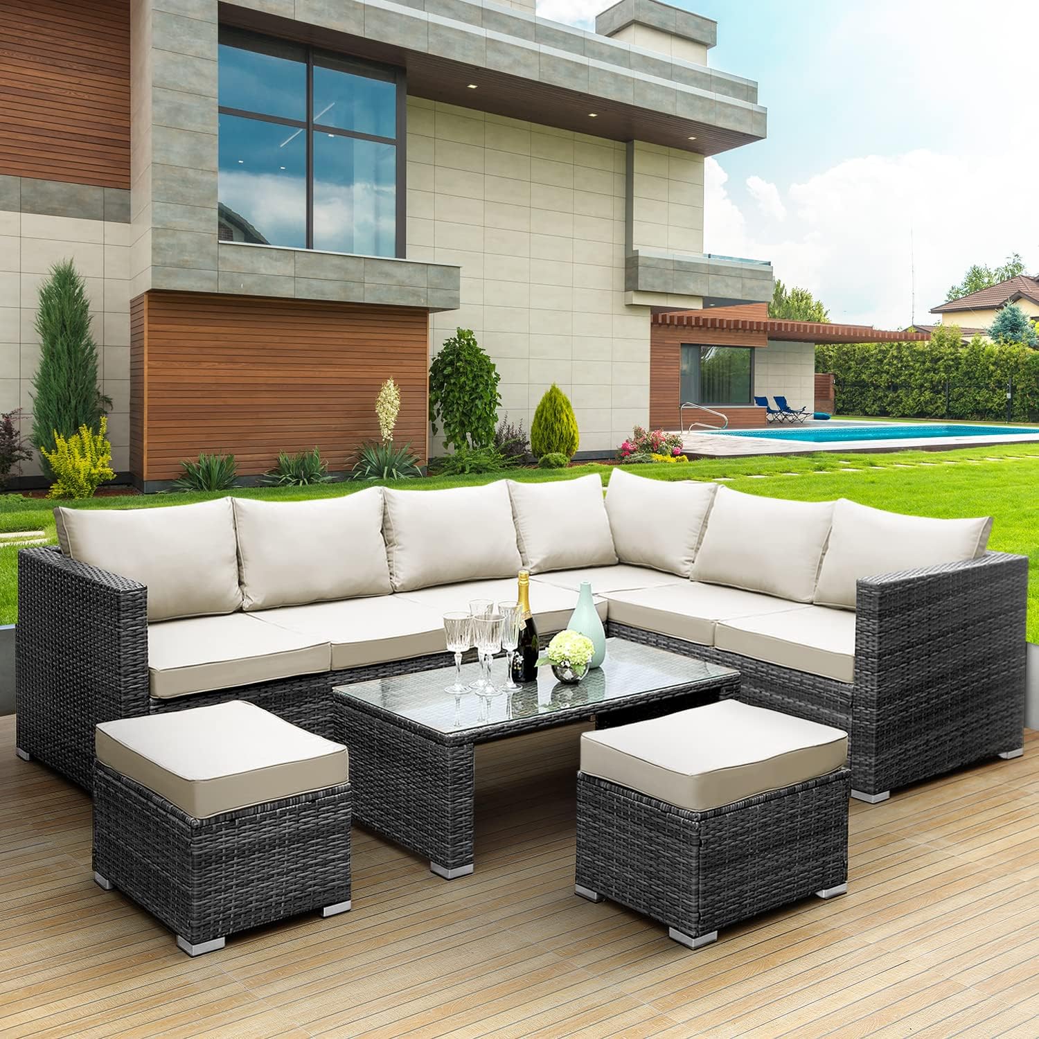 Upgrade your outdoor experience with our luxurious 8-seater outdoor rattan furniture! This garden furniture set includes a comfortable rattan corner sofa, two stools, a coffee table with tempered glass, and 15 thick, lofty sponge-padded water-resistant cushions. The wide and deep chairs provide ample room to sit comfortably and enjoy your leisure afternoon teatime.