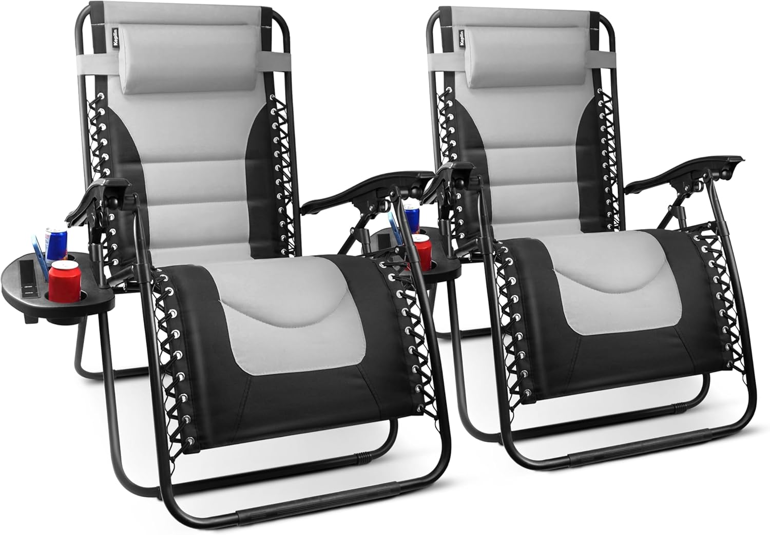 KEPLIN Set of 2 XXL Premium Heavy Duty Textoline Zero Gravity Chairs – Luxurious Garden Recliners, Adjustable Headrest, Cup & Phone Holder, Foldable & Easy to Clean Patio Sun Loungers (Grey)