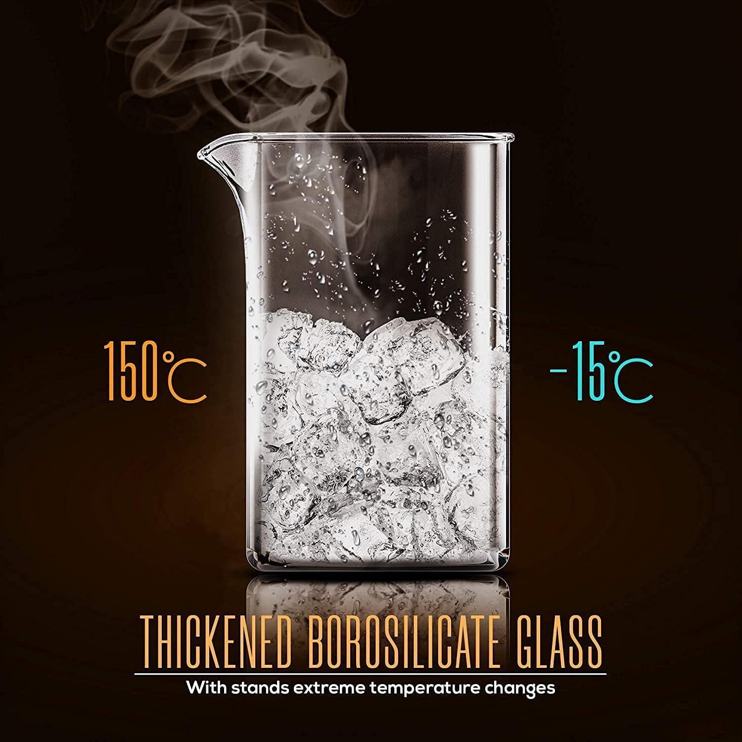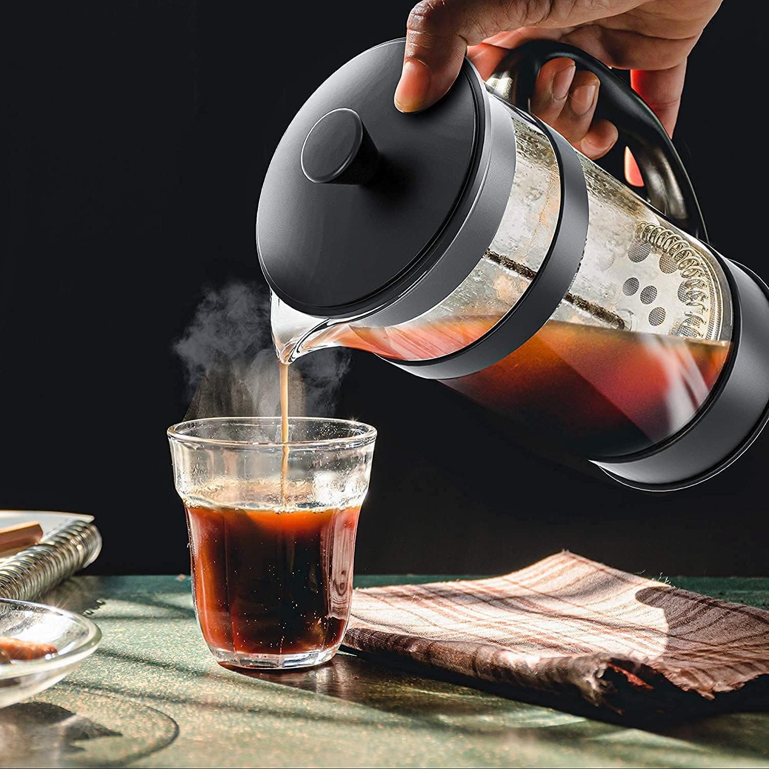 Durable French Press made of borosilicate glass, heat-resistant, sits in a stylish, insulated plastic frame that makes the entire process of making and pouring very easy and prevents wobbling.