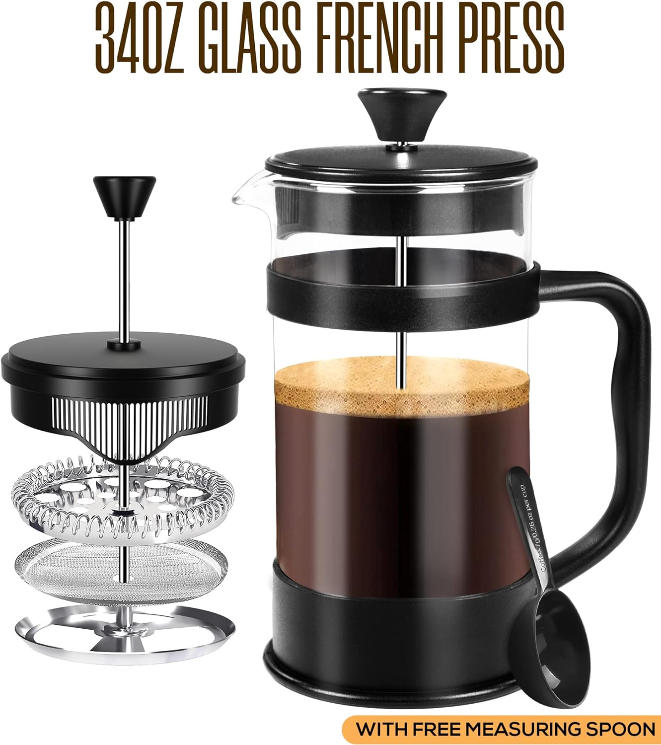 KICHLY 1000ml Cafetiere 8 Cup French Press Coffee Maker, Coffee Press and Tea Maker with Triple Filters, Heat Resistant Borosilicate Glass Caffettiere with Steel Plunger, Black