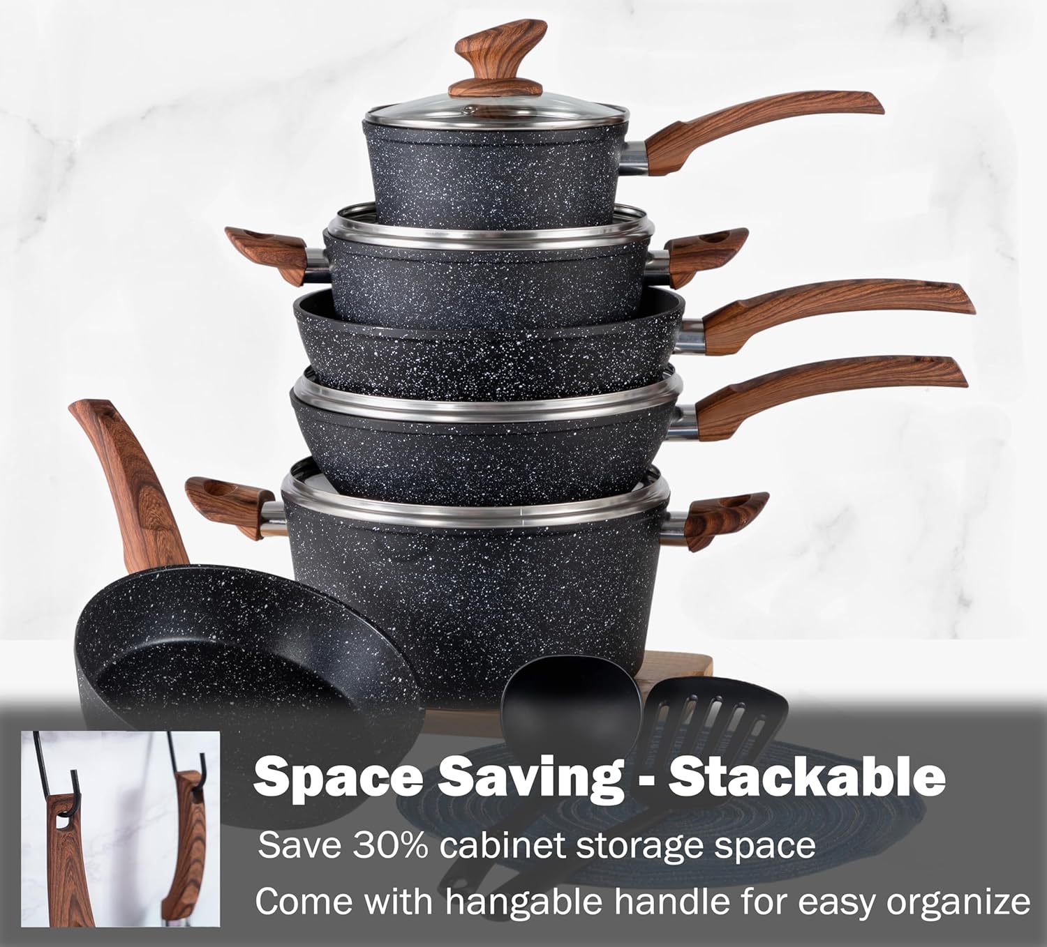 🔥Granite Cookware Set with Bakelite Handle – Bakelite is used because it has heat-resistant properties and is an electrical insulator. Bakelite would not burn when exposed to high heat. Bakelite is safe up to 350 degrees F, for a limited time. Dark bakelite handle is more stain-resistant and easy to clean too.
