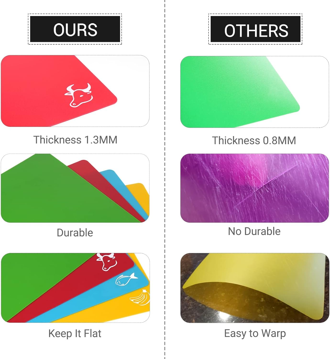 SAFE HOME KITCHEN PREP — The chopping board is made of high-quality food-grade materials, naturally nonstick and BPA FREE! The plastic board provides a solid surface that can be used without worrying about foods residue or leaving a knife mark. The cutting mat with a thickness of 1.3 mm can better meet the requirements of flexibility and durability.