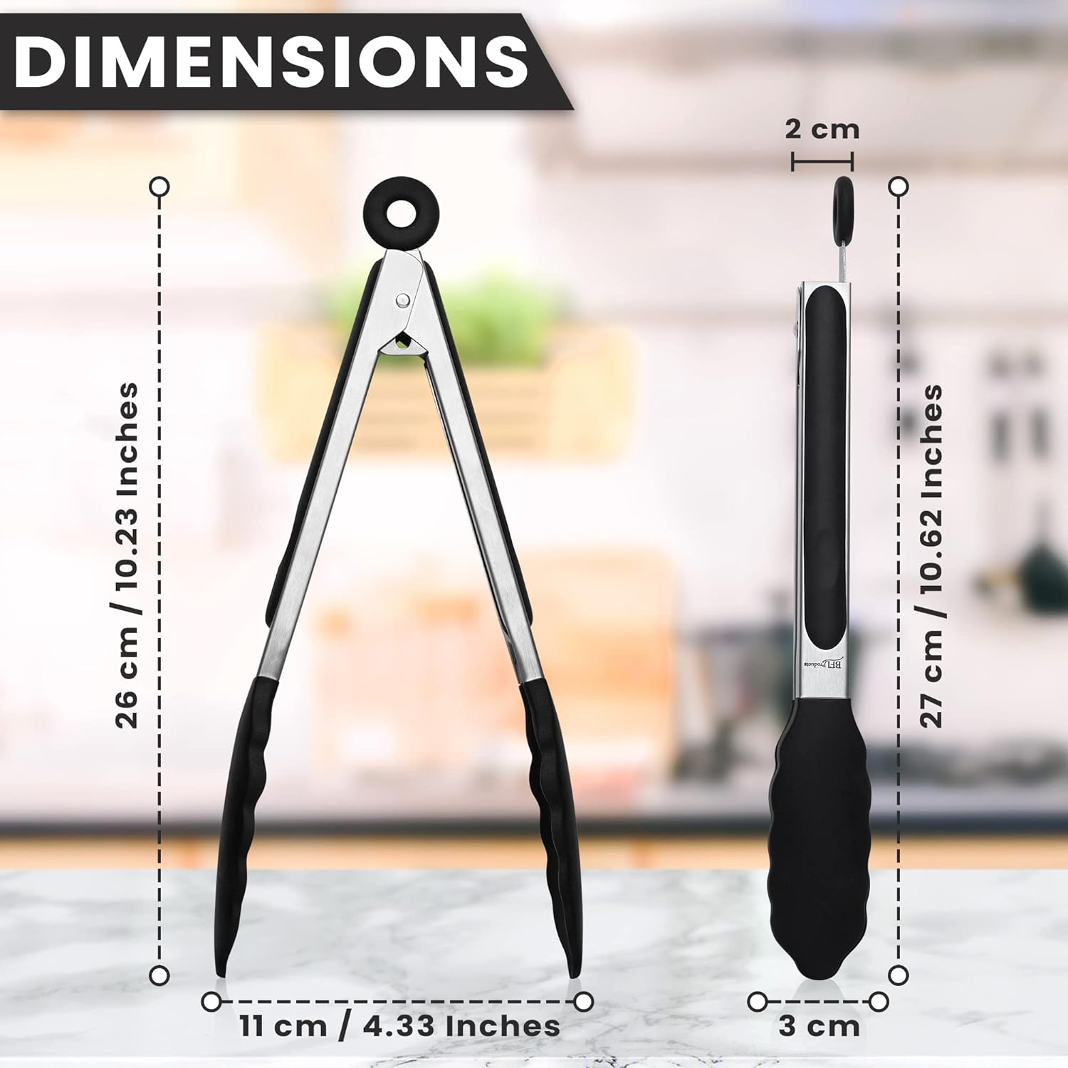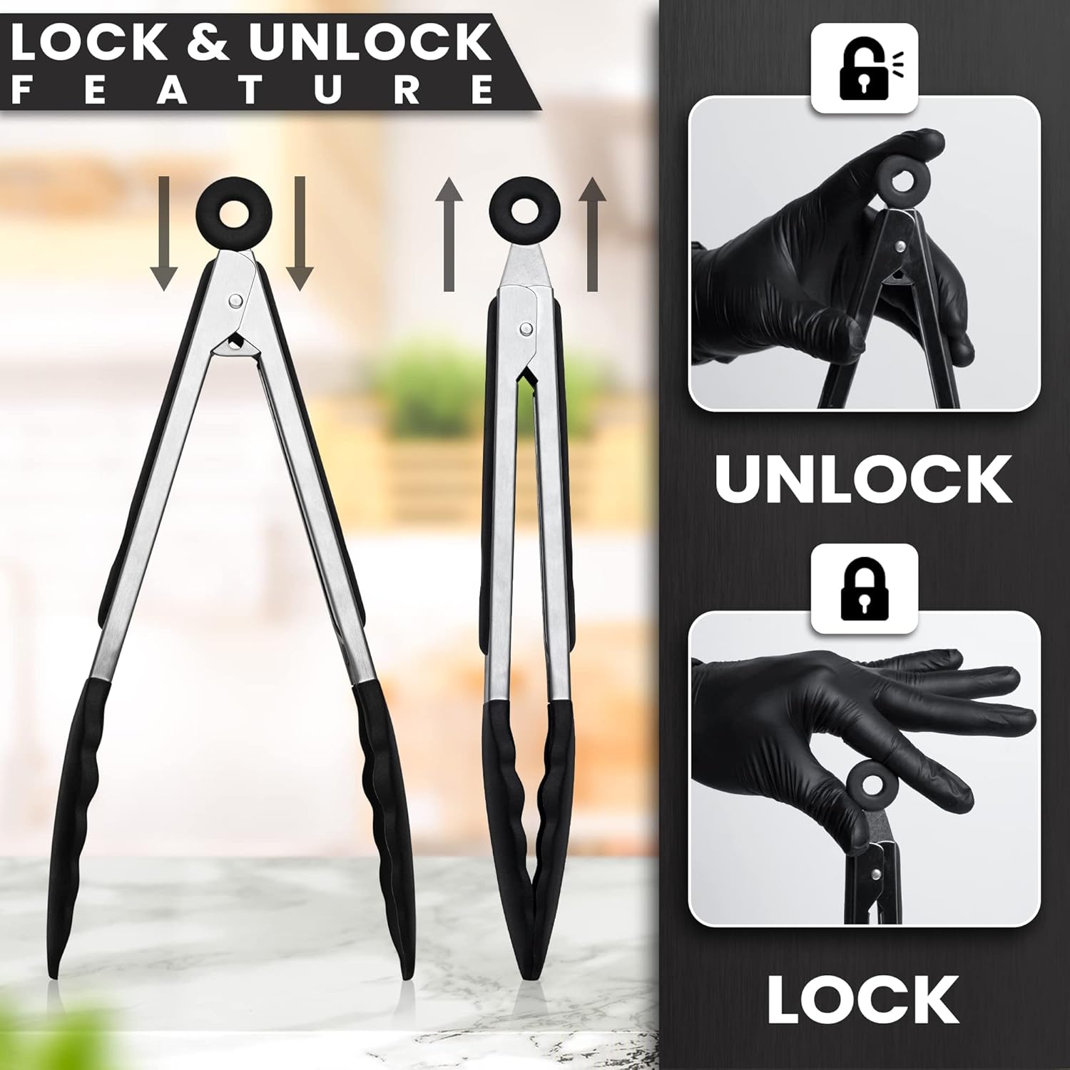 Kitchen Silicone Tongs 9 Inches | Stainless Steel Handle with Easy Grip and Smart Padlock System | Curved Silicone Tip for Strong Grip | Handy Tong for BBQ, Serving, Frying, and Cookin (Black).