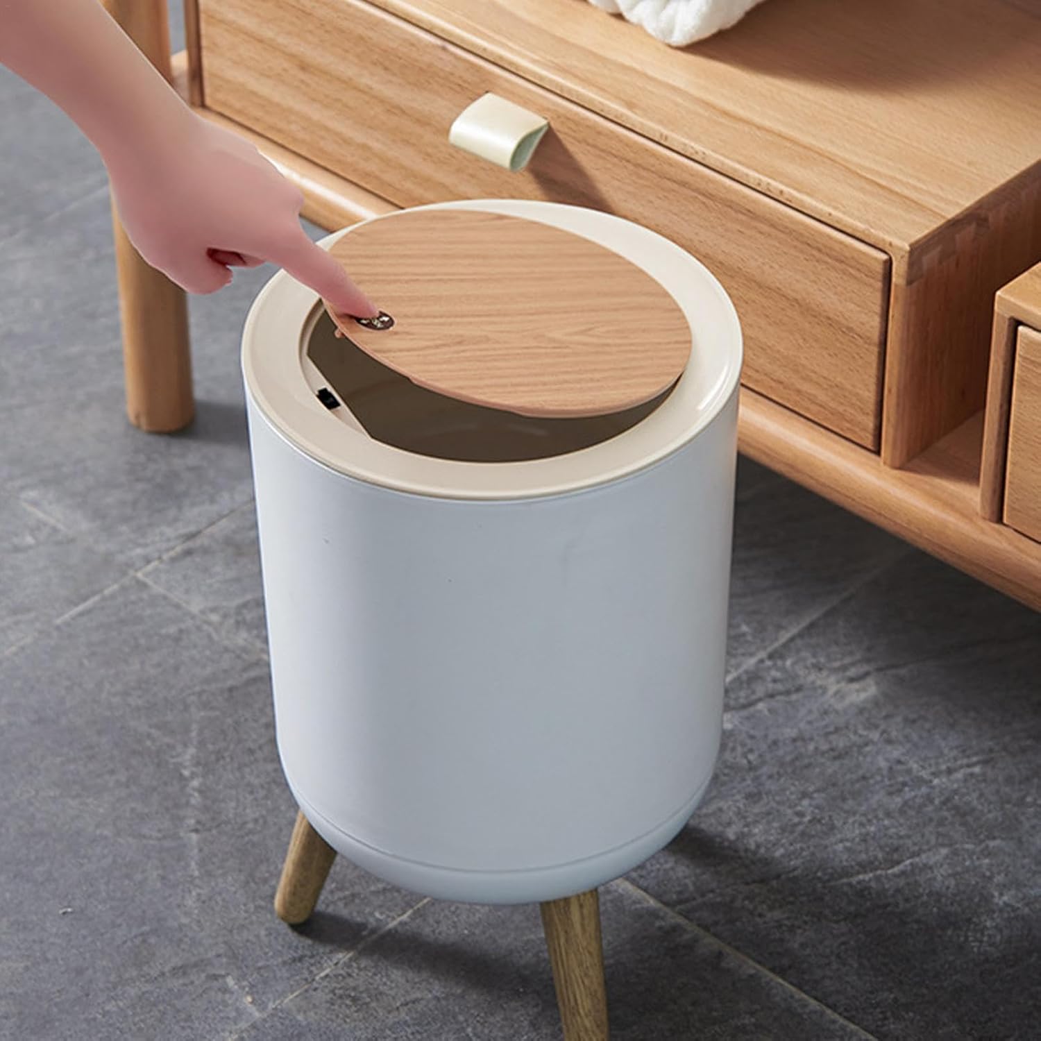 Ease of Use Wooden Tripod Trash Bin: Specially designed with a sensitive push-to-open , this white trash can provides unparalleled convenience and effortless opening whenever you need it. Portable and practical!