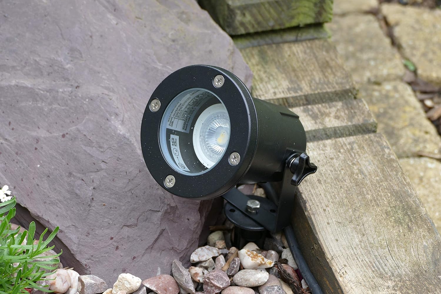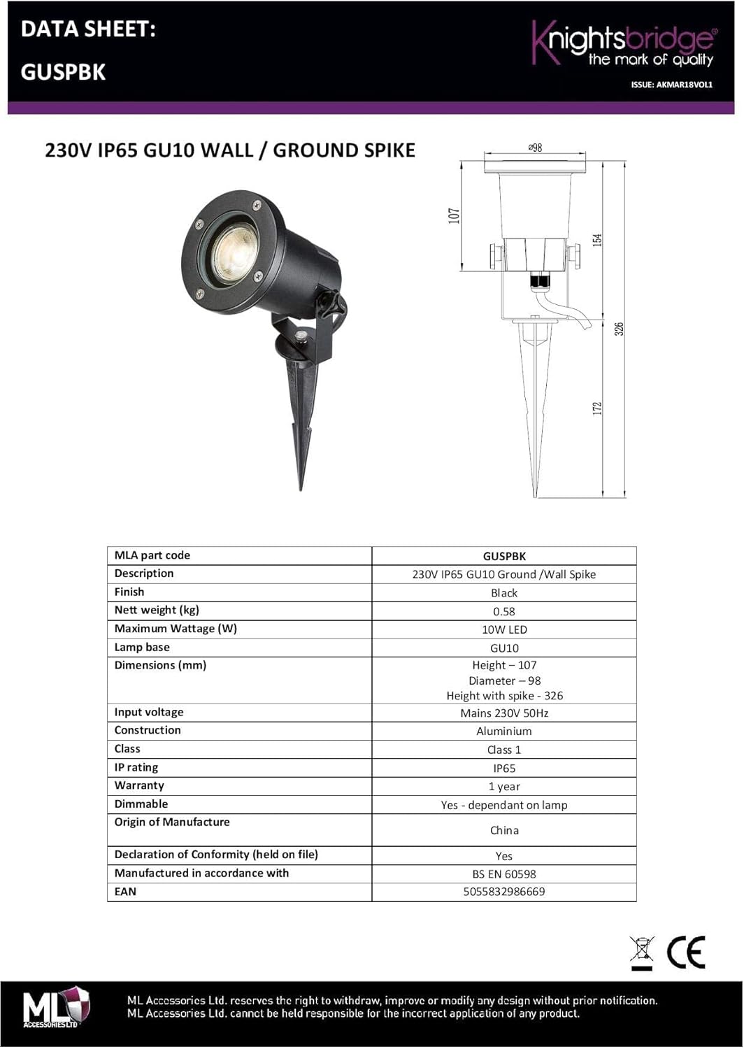 230V IP65 GU10 garden spike spotlightSupplied with wall mount and spikeManufactured from Die-cast Aluminium and powder coated in black to give a long lasting weather resilient coating