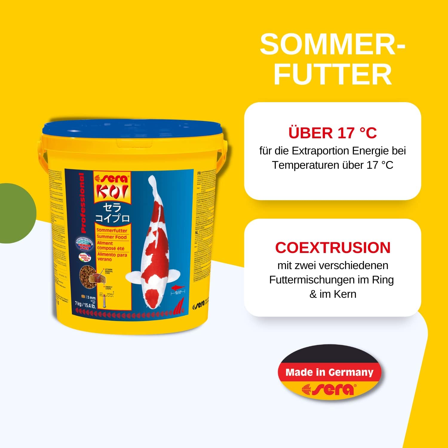 Summer is growth time for Koi and other pond fish. Plenty of energy is required for this, which is obtained from high quality food. sera KOI Professional Summer Food provides a balanced protein/fat ratio. Strong and healthy growth and optimal energy supply are the result. The unique sera process of co-extrusion allows combining differently treated ingredients. The ring contains high quality proteins and fats according to the natural nutrition spectrum of the fish for optimal digestibility. The core consists, among others, of essential vitamins, minerals and trace elements for healthy growth and a strong immune system.