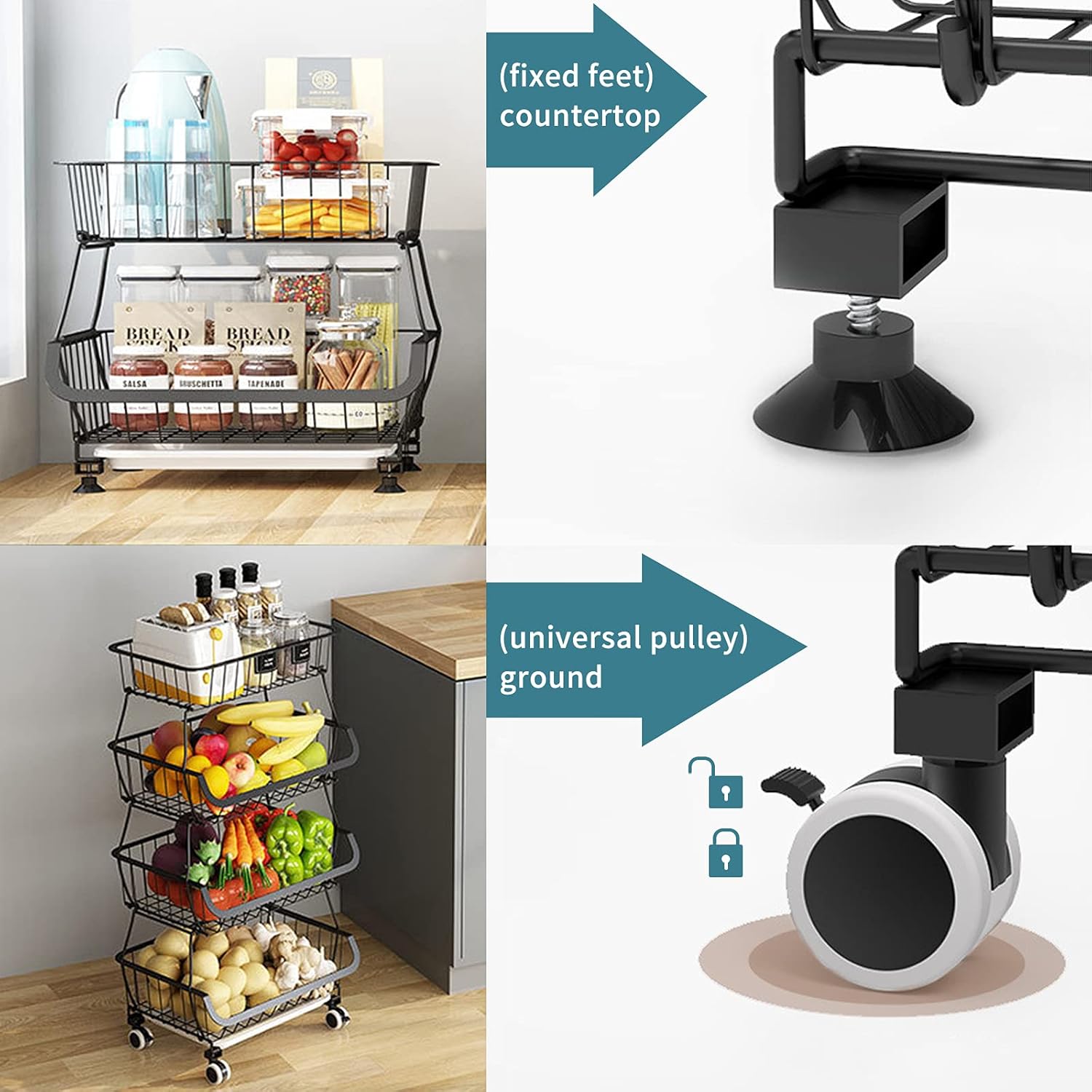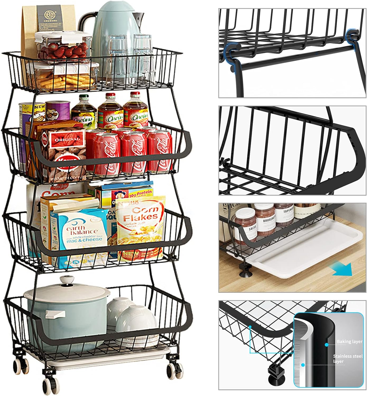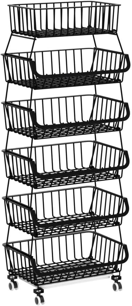 KOLENSA Metal Wire Baskets with Wheels, Stackable Storage Bins Kitchen Organizer Shelf 3-4-5-6 Tier Fruit Vegetable Cart Dishes Rack Shelves for Garage, Pantry, Bathroom and Produce holder