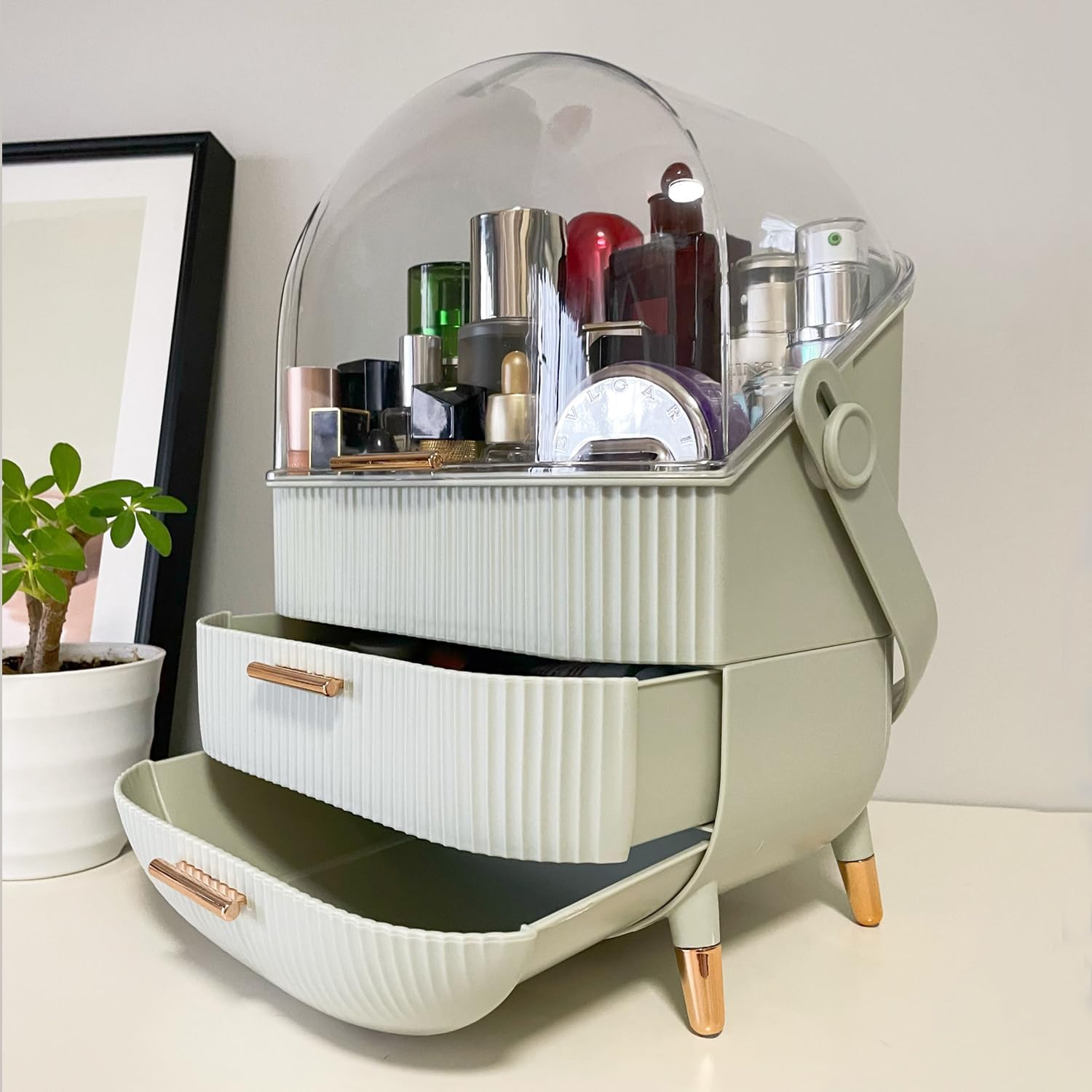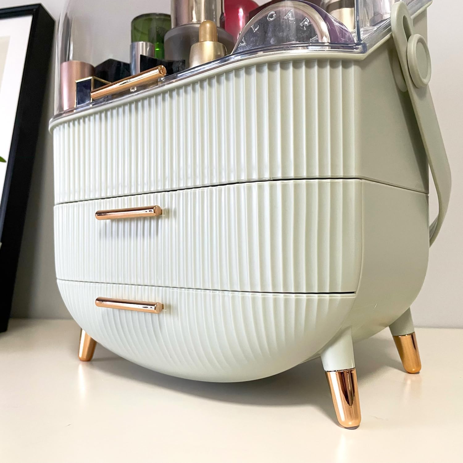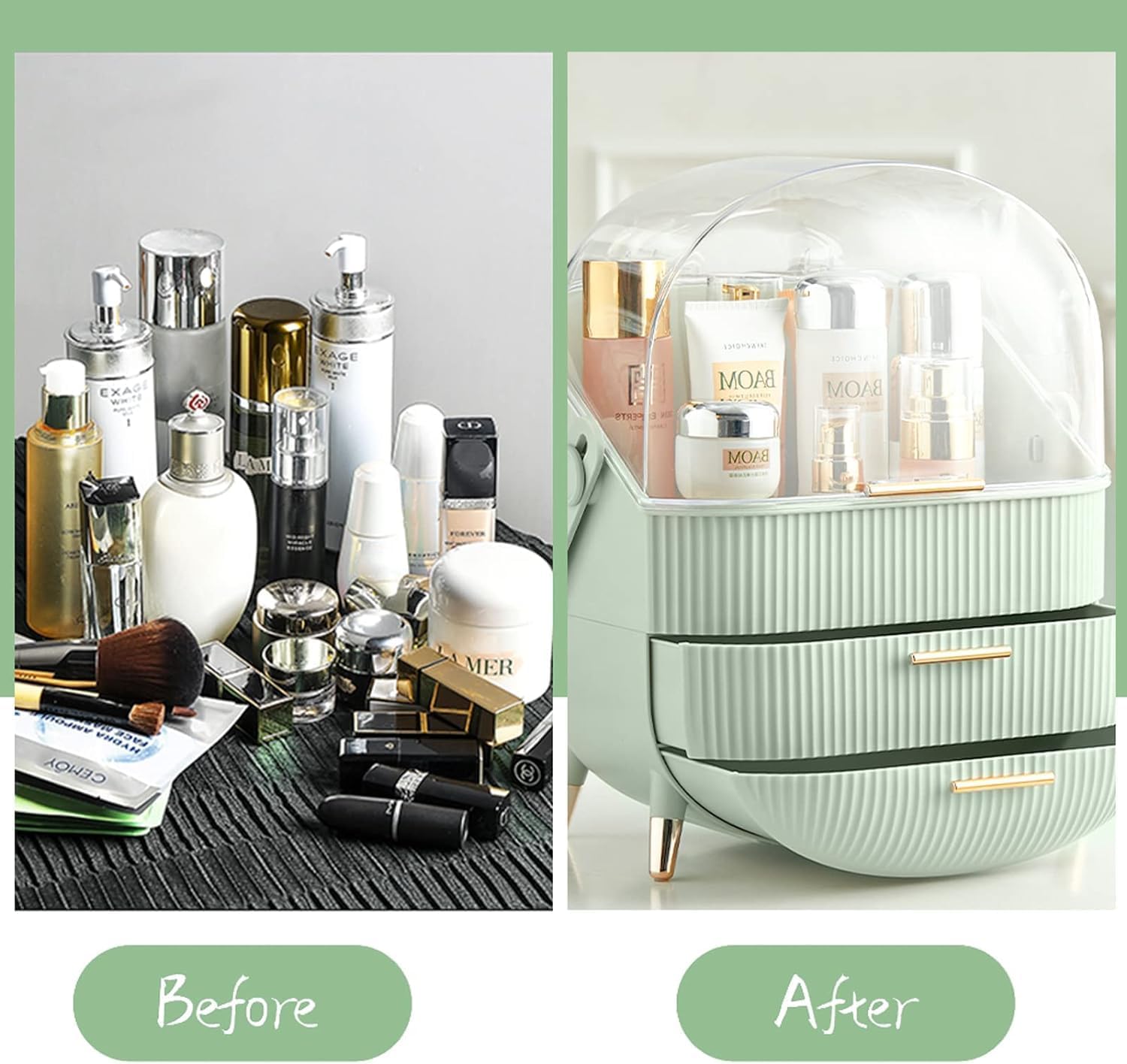 This makeup organizer is large in capacity to meet your needs at home. It can store all your makeup essentials in one place and keeps your bathroom dresser tidy and organized.The top space can store the skincare, lotions, foundations and perfume. The storage drawers can store lipsticks, makeup brushes, eyeshadow palettes, eyeliner, loose powder, facial masks.