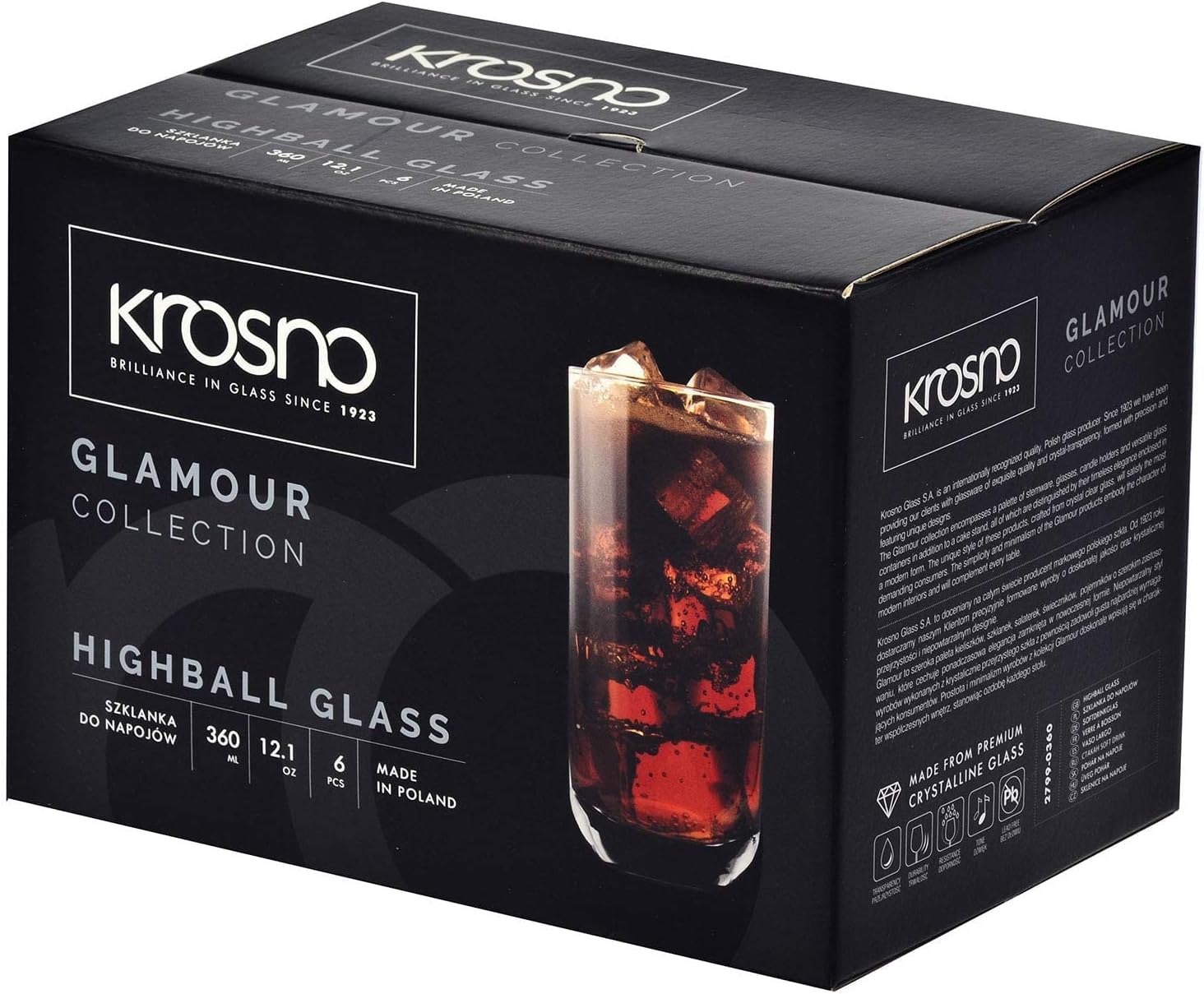 Krosno Long Tall Water Juice Mojito Drinking Glasses | Set of 6 Highball Glasses | 360 ML | Glamour Collection | Half Pint Cocktail Glasses Tumblers | Home & Parties | Dishwasher Safe Tumbler Glasses