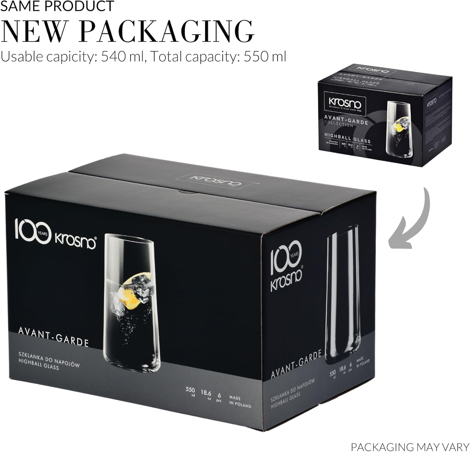 Krosno Tall Water Drinking Glasses Set of 6 | 540 ML | Avant-Garde Collection | Highball Glasses & Tumbler Glass Set | Juice Half Pint Highball | Home, Restaurants and Parties | Dishwasher Safe