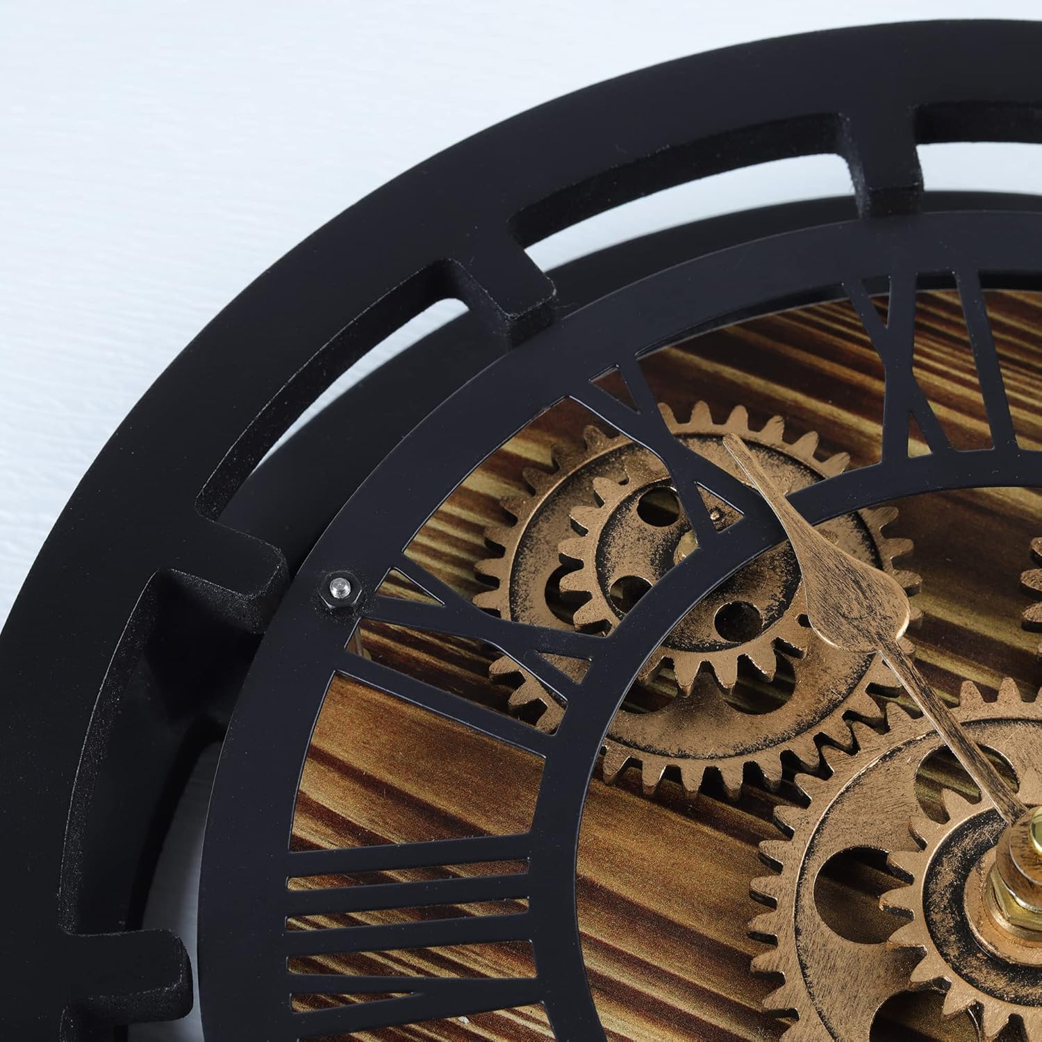 Farmhouse & Rustic: Add a touch of vintage flair to your home decor with this wooden black wall clock. The black MDF frame and Roman numerals, wood grain dial and base, gold metal clock hands and moving gears provide a steampunk industrial appearance. Very stylish and unique, easily to attract other’s attention.