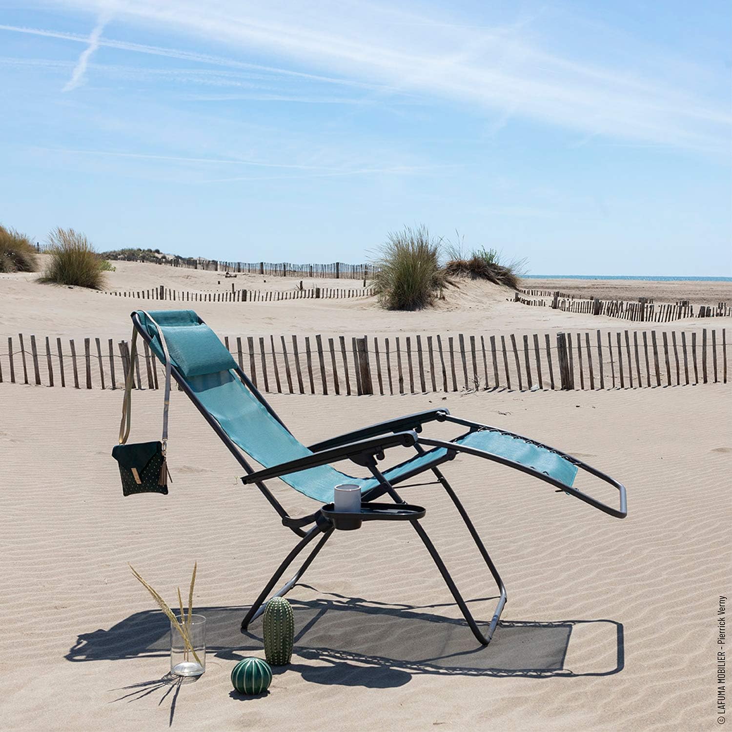 Maximum comfort: Long-lasting support thanks to the Texplast fabric connected to the frame by a lace system, Adjustable and removable headrest, High UV resistance, Quick drying