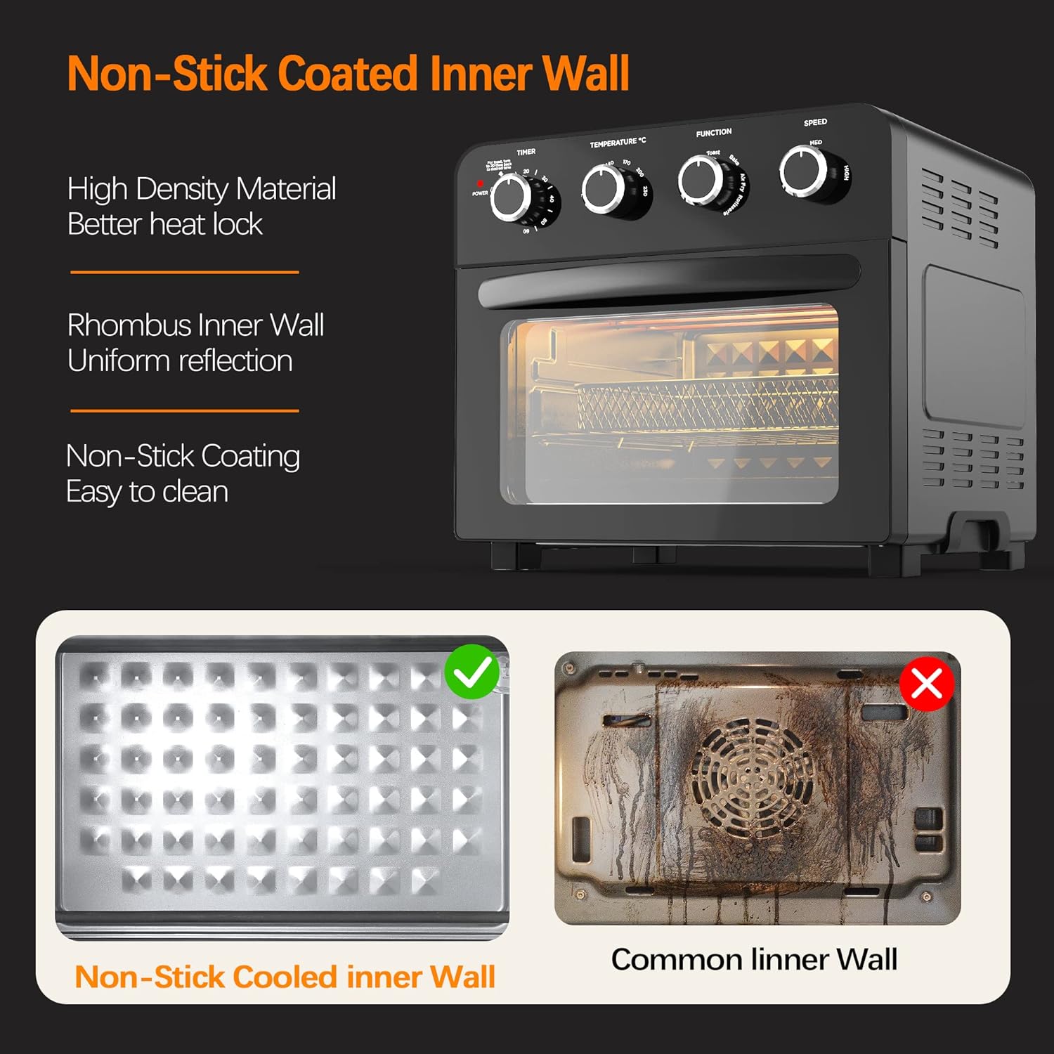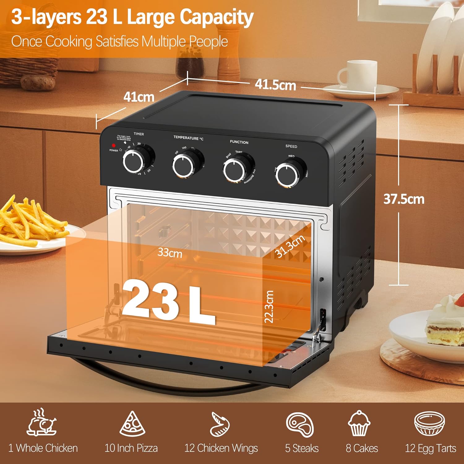 【23L Large Family Size】Built-in three-layer 23L large capacity, cooking can be done at one time, saving kitchen space. It can hold 4-6 people sized chips, 18 chicken wings, a 10-inch pizza, 1.5kg of French fries, and 12 pieces of toast. High-grade Stainless steel exterior, aluminized diamond-shaped inner liner, stylish and beautiful, evenly heated, and easy to use and clean.