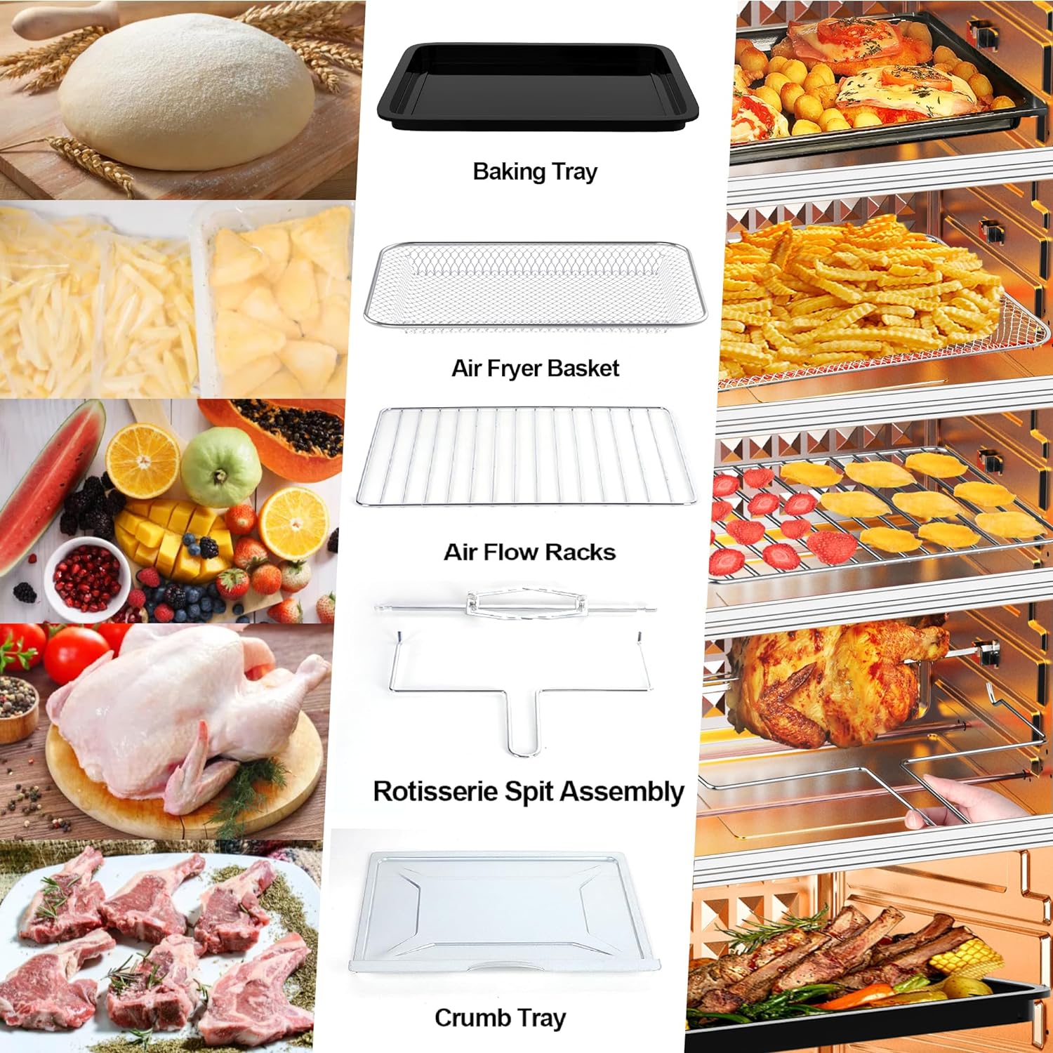 【Free Accessories & 100 Recipes】 We also has 6 thoughtful accessories for Air Fryer Oven (1 Rotisserie Spit Assembly, 1 Baking Rack, 1 Air Fryer Basket, 1 Baking Tray, 1 Rotisserie Removable Tool, and 1 Crumb Tray) for your family Life brings more healthy and delicious. It also comes with 100 recipes. Our air fryer oven promises a 1-year warranty. If you have any questions, please feel free to contact the 24-hour online customer service.Customers say
