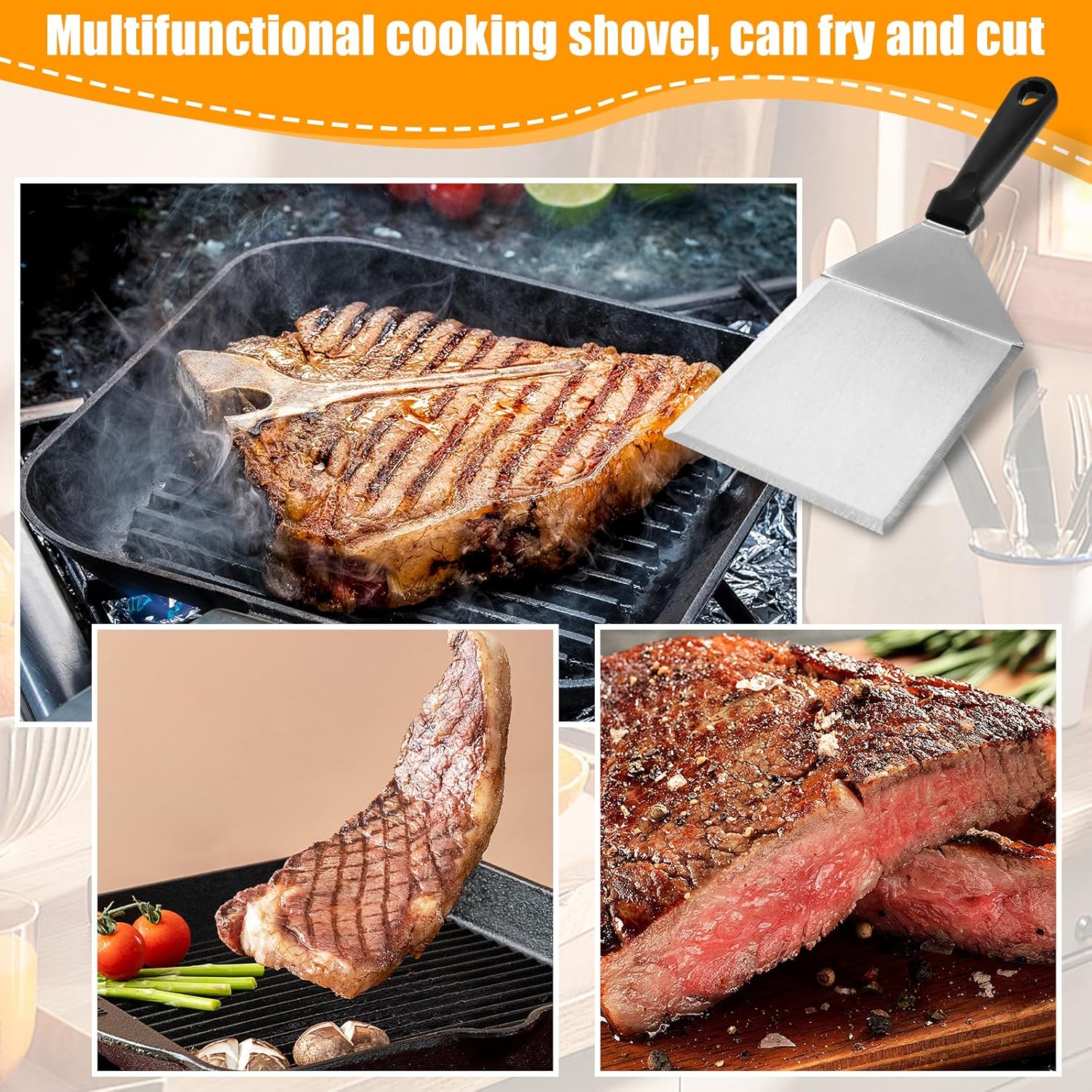 The metal spatula can not only used for cooking at home but also for shoveling desserts at parties and frying steaks at barbecues, good looking and practical. Fit for grill beginner or professional restaurant chefs, a good griddle grill accessories for backyard BBQ.