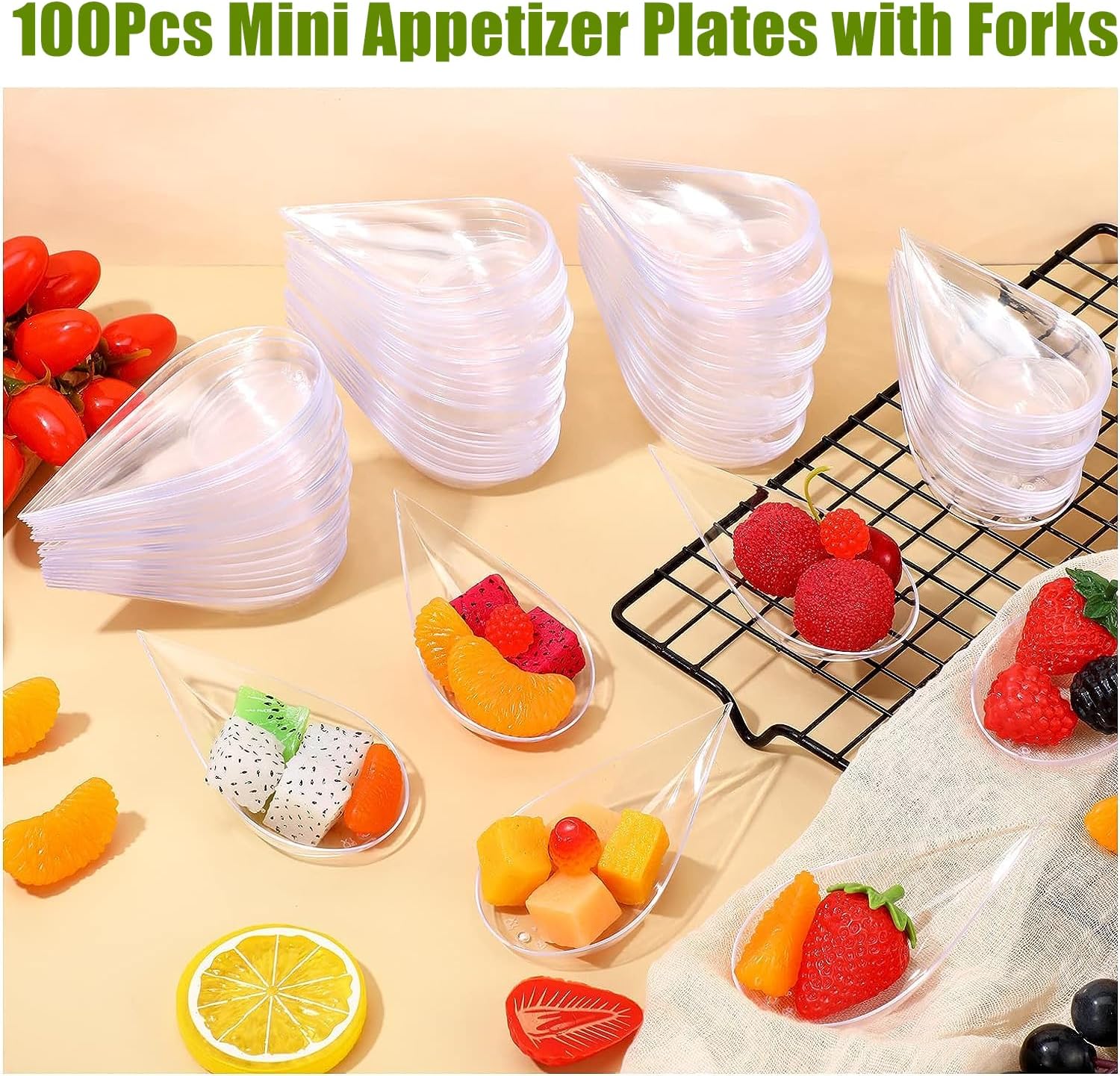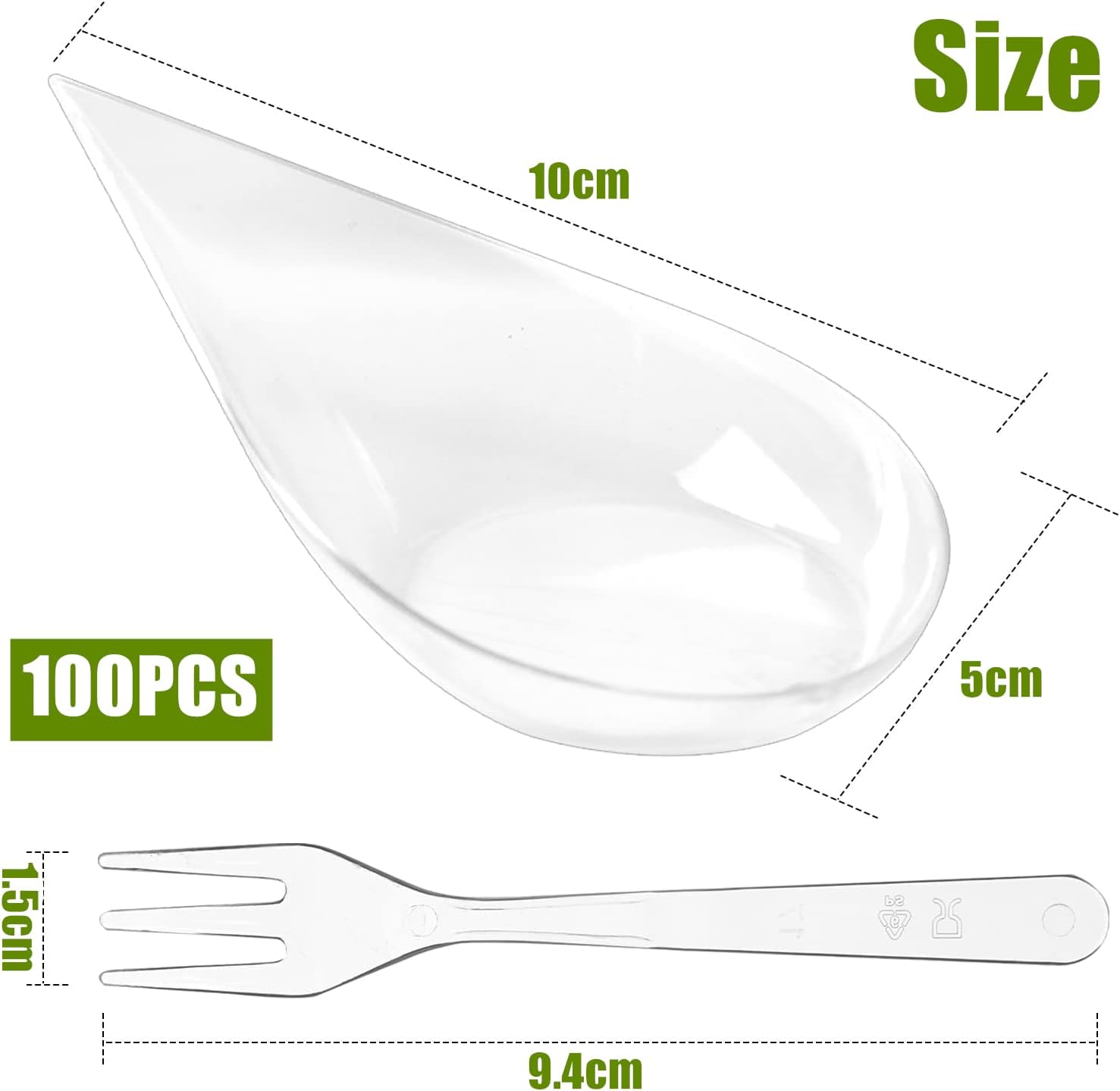 LATERN 100Pcs Plastic Appetizer Plates with Forks, 5CM Tear Drop Dessert Tasting Dishes Clear Parfait Appetizer Bowls Reusable Serving Plates for Dessert Appetizers Sample Party (10 x 5cm)