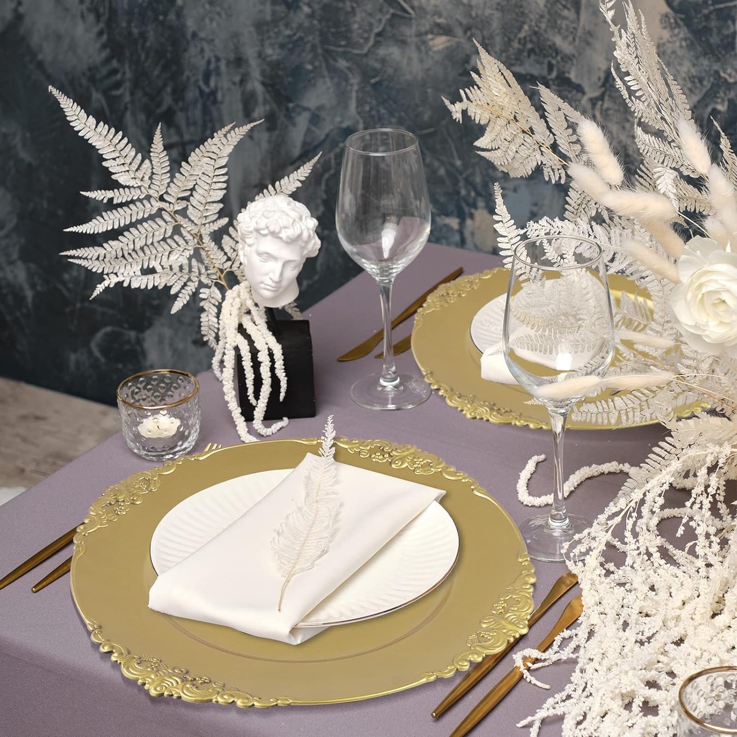 LATERN 12Pcs 33CM Multi-Use Gold Charger Plates with Embossed Rim has elegant appearance, perfect for Christmas parties, birthday parties, banquet dinners, gatherings, weddings and various holidays, such as Valentine’s Day, Easter, Halloween, Thanksgiving Day etc!