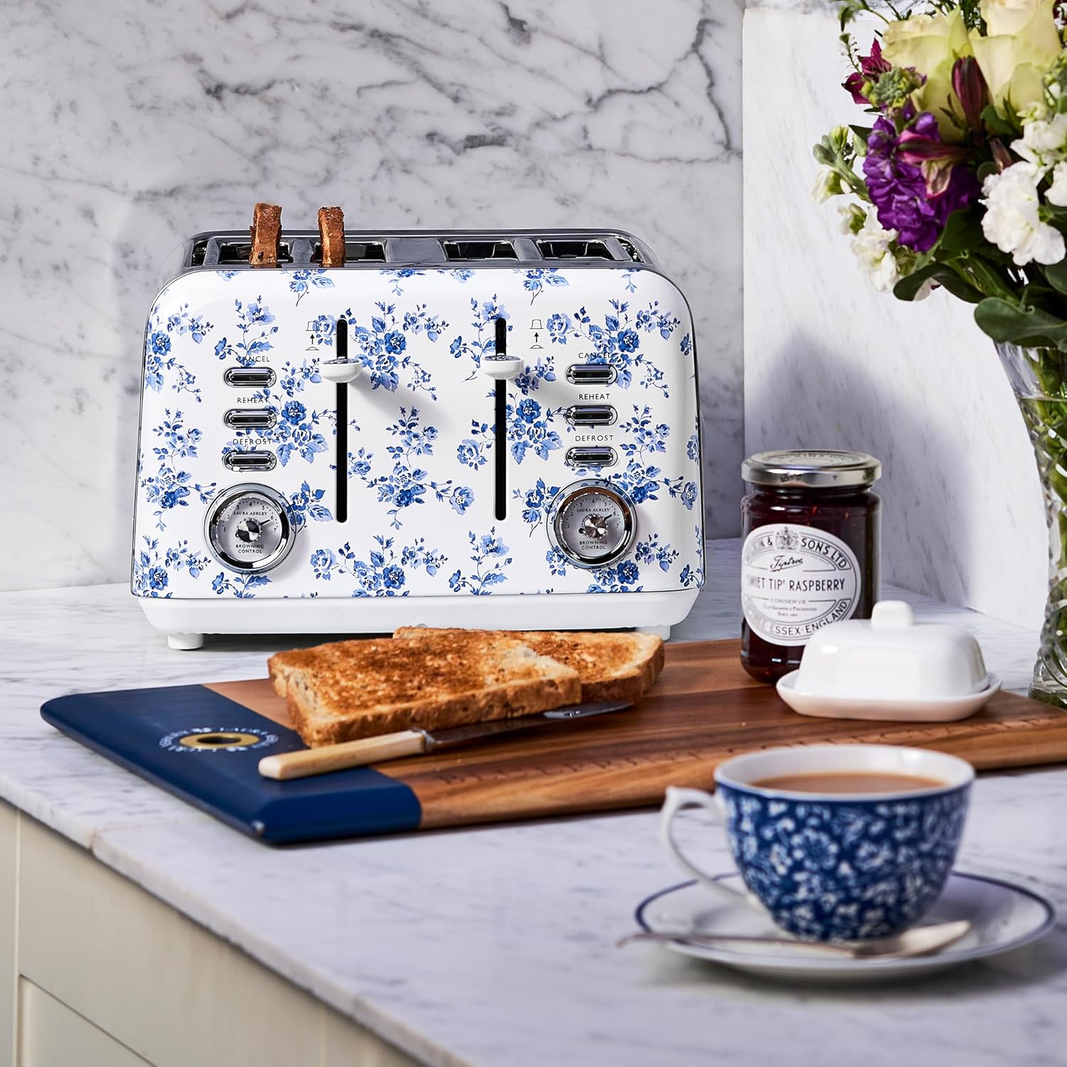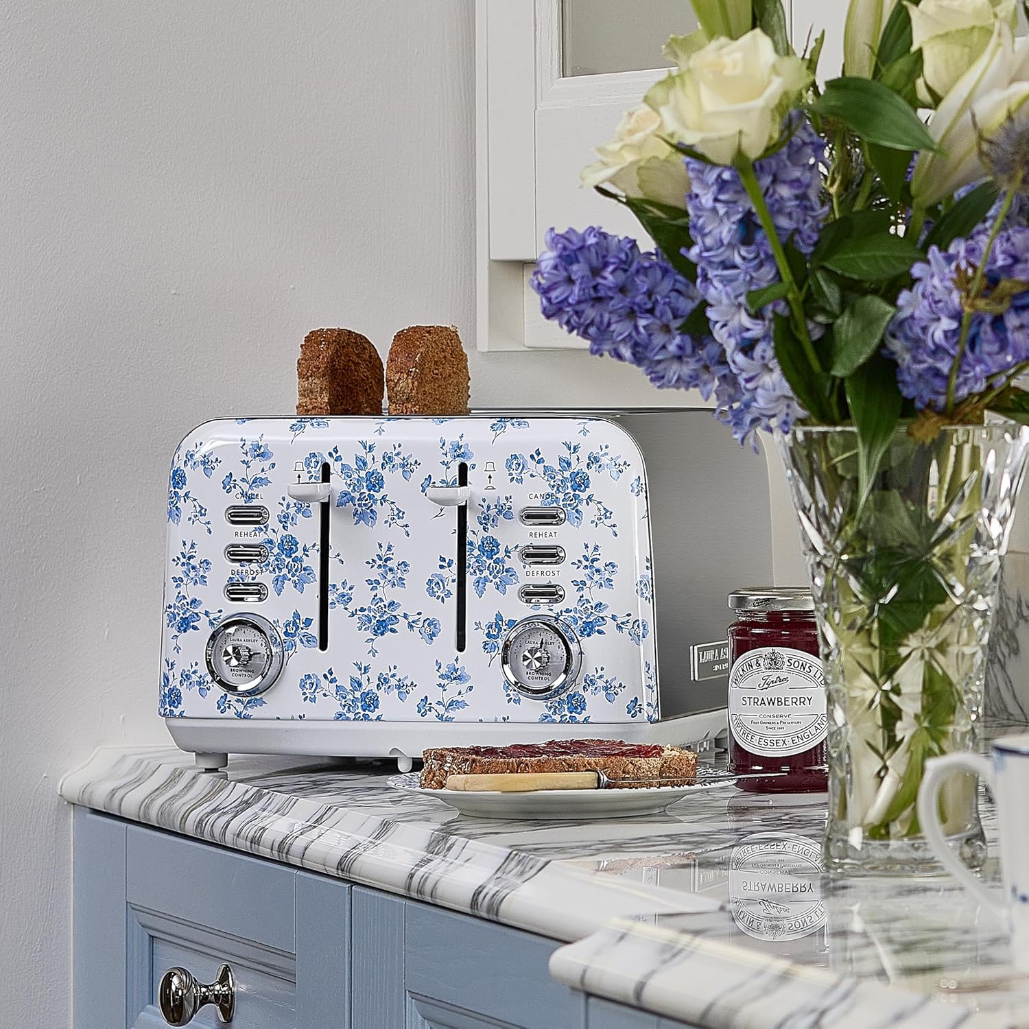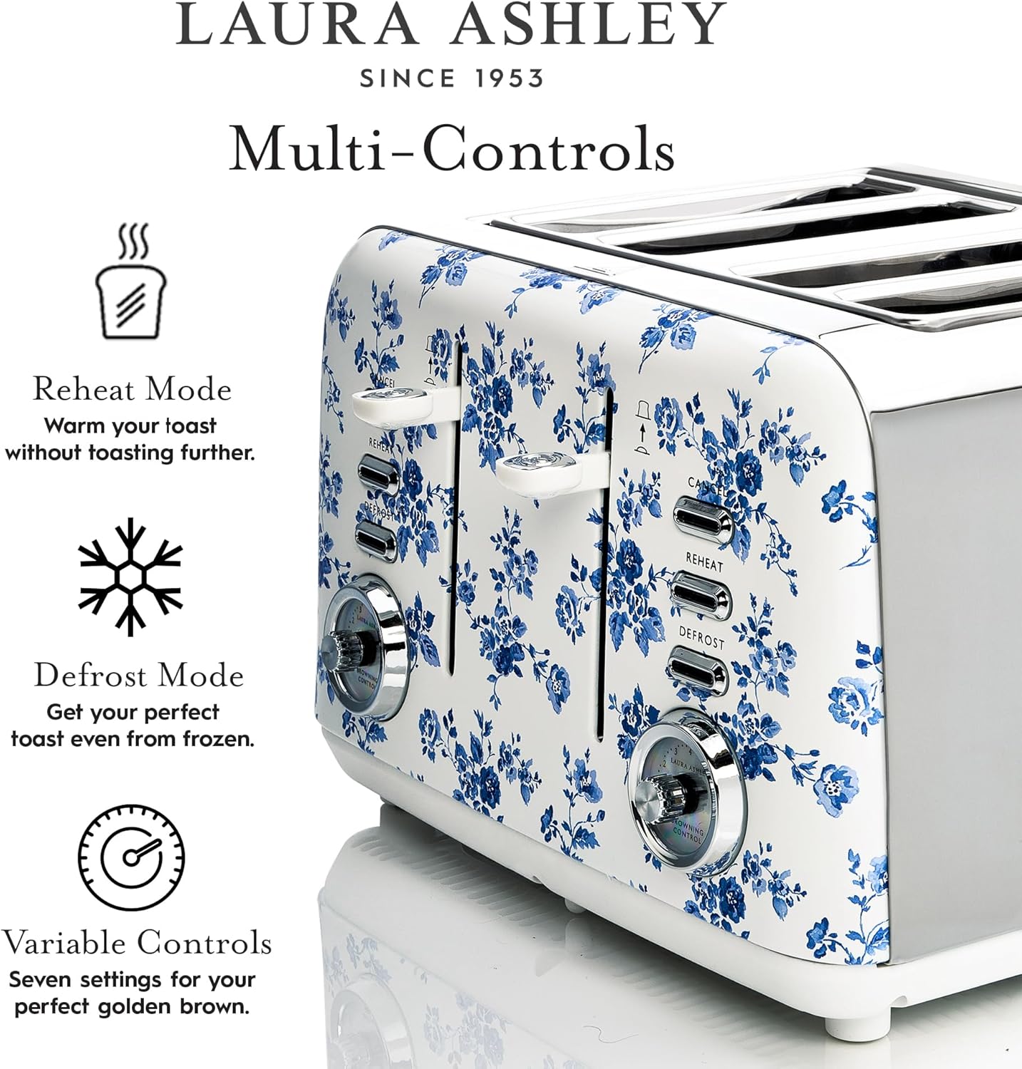 Laura Ashley China Rose 4 Slice Toaster By VQ – Multi-Functional Toaster with Adjustable Heating, Defrost & Reheat Modes. Stainless Steel Body, 4 Wide Slots & includes a Croissant Warming Rack
