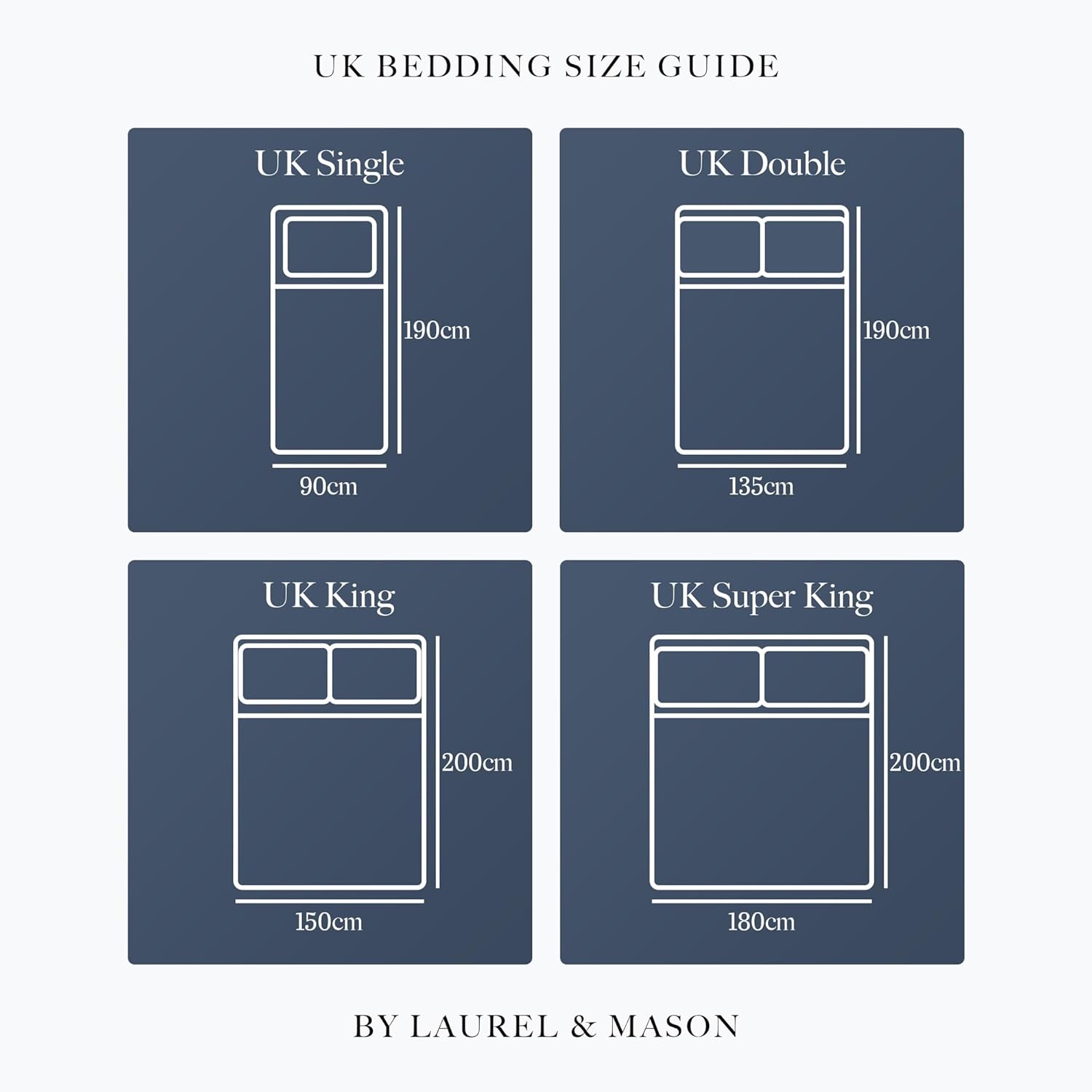 MEASUREMENTS – UK Single: Duvet Cover 135 x 200cm, Fitted Sheet 90 x 190 x 32cm, Pillowcases: 51 x 75cm.UK Double: Duvet Cover 200 x 200cm, Fitted Sheet 135 x 190 x 32cm, Pillowcases 50 x 75cm. UK King Size: Duvet Cover 225 x 200cm, Fitted Sheet 150 x 190 x 32cm, Pillowcases 50 x 75cm. UK Super King Size: Duvet Cover 230 x 260cm, Fitted Sheet 200 x 200 x 40cm, Pillowcases 51 x 91cm