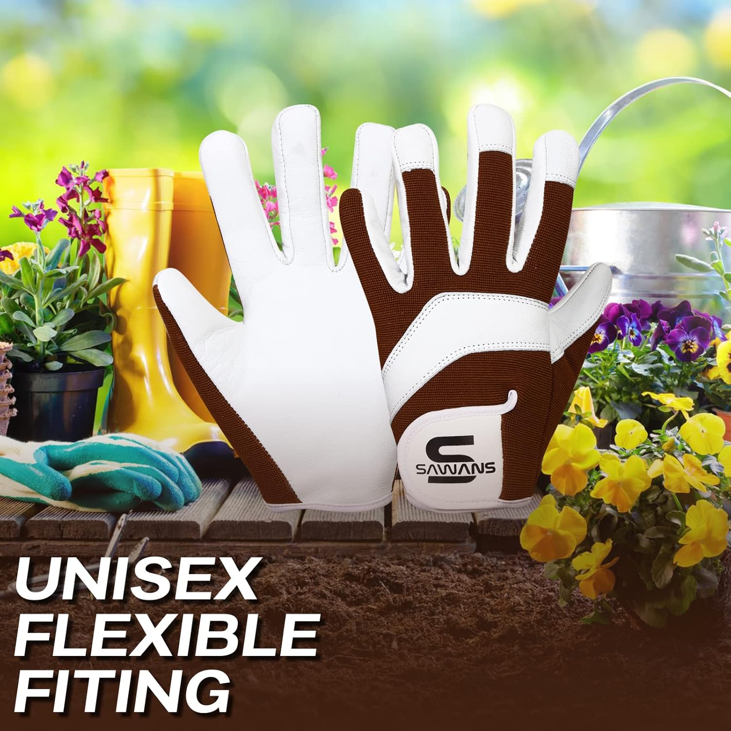 Leather Gardening Safety Working Gloves Thorn Proof for Men and Women Multipurpose Garden Gloves for Ladies Durable Mechanic Builder Construction Non-Slip (Medium, White/Brown)