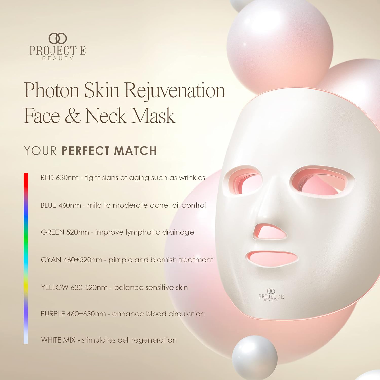 LED Face & Neck Mask by Project E Beauty | Skin Rejuvenation | LED Therapy Photon Mask | 7 Colors | Anti Aging | Acne Spot Removal | Reduce Wrinkles | Anti-inflammation | Brightening Skincare Mask