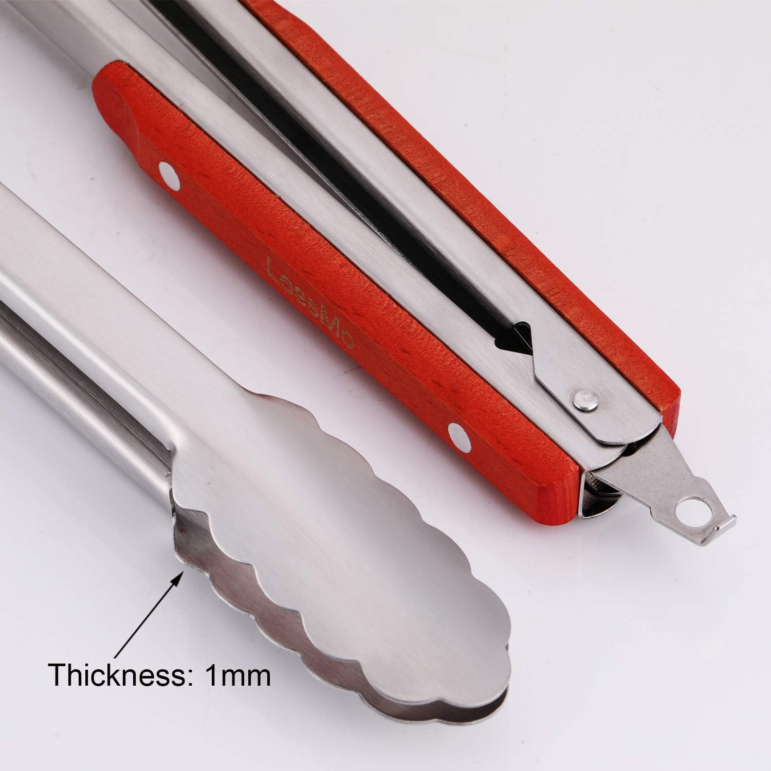 Material: Made of matte brushed stainless steel and high quality beech wood to enable non-slip and heat resistant grip. The stainless steel and beech wood is of high quality and with high stability, which means this LessMo kitchen tongs can serve you for more than 10 years.