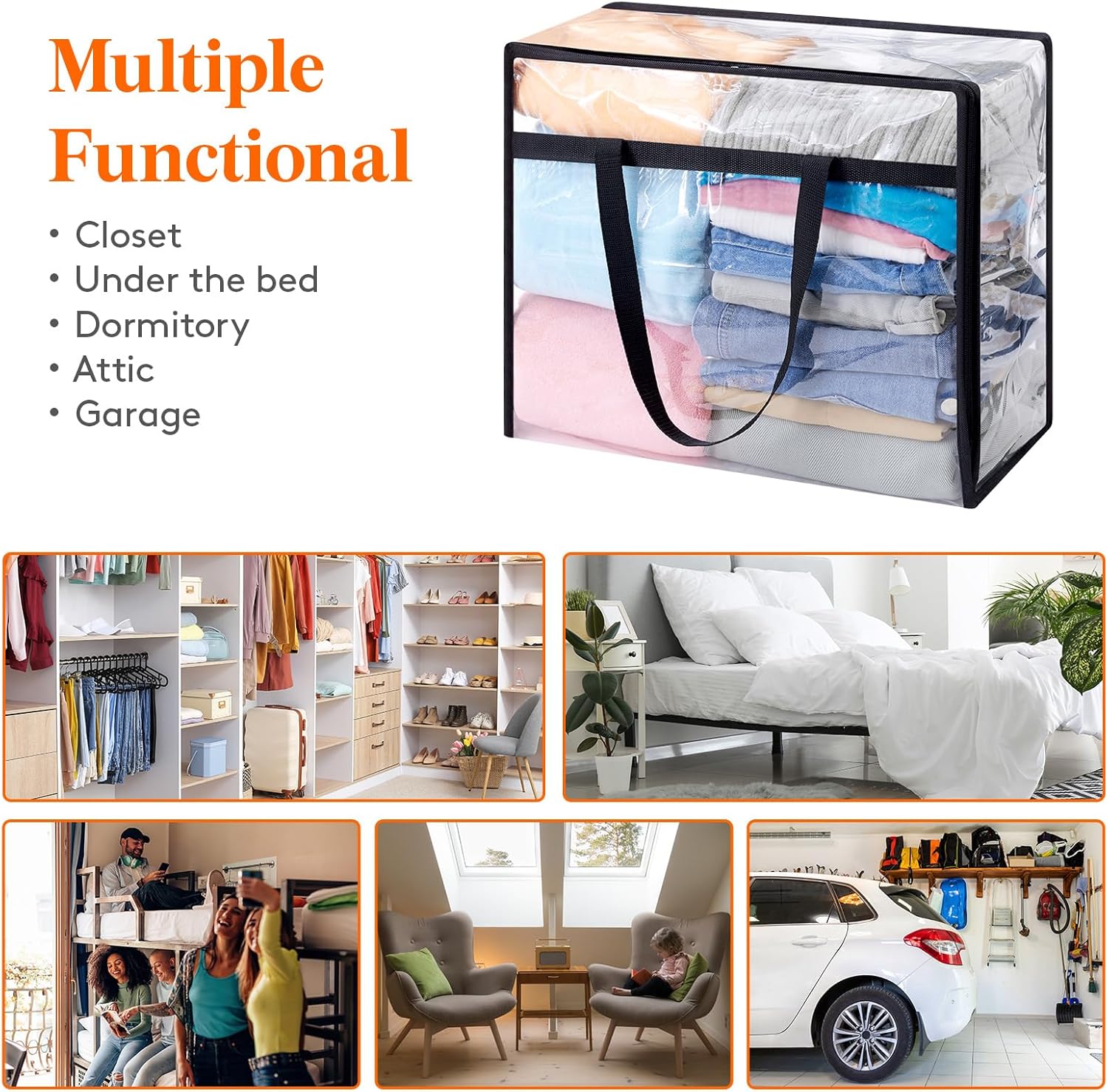 I needed to find ways to store my large blankets and comforters. The bags arrived quickly. Packaging was very good. Bag sizes were just what I needed. Handles are well made and comfortable to hold. Zippers excellent. Being a clear bag makes it easier to see what is inside. For example, I was able to fit a Queen comforter with matching sheet one bag easily. In another. I was able to pack several thick throw blankets into another. I Also used these to store winter coats and seasonal clothing. So many uses for these bags. I highly recommend and will order more as I organize my storage needs. Highly recommend.