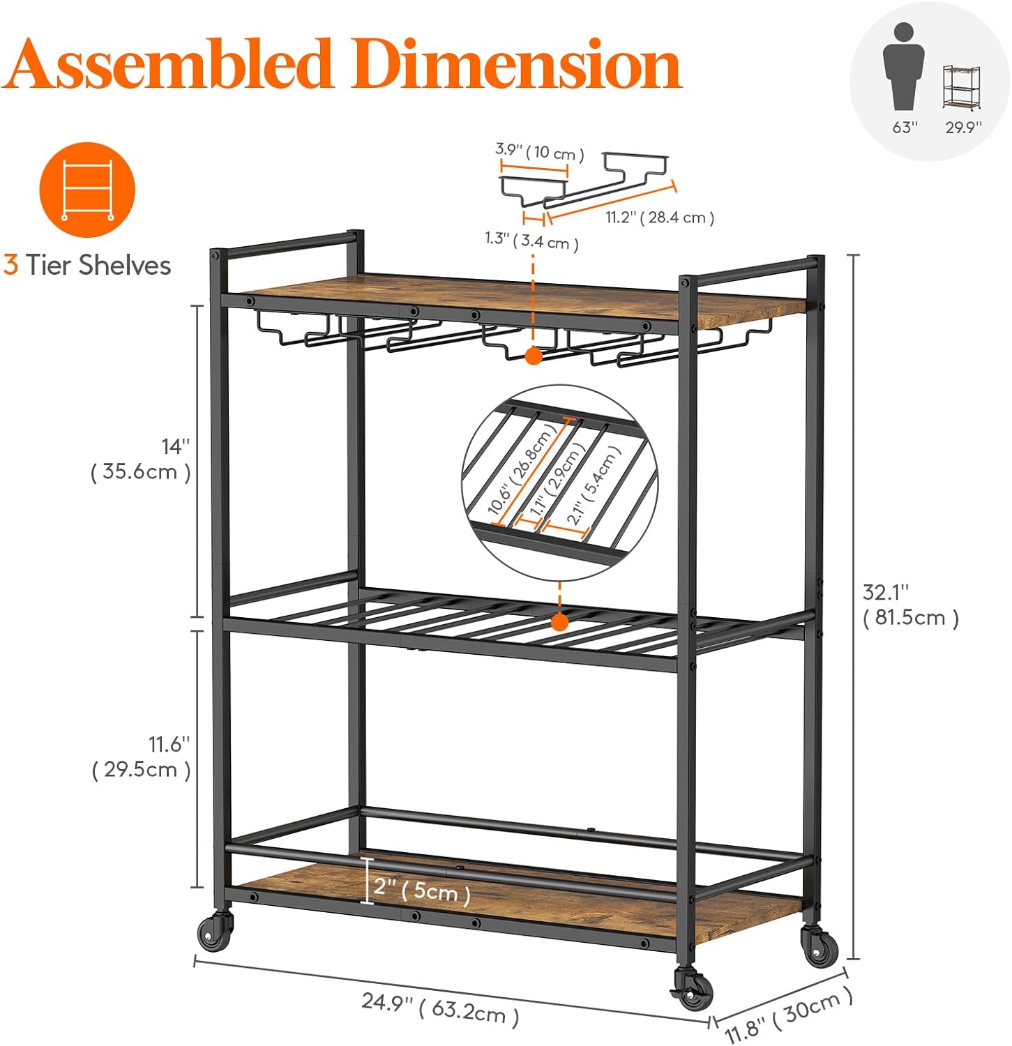 Efficient Space Utilization: Measuring 24.9″ x 11.8″ x 32.1″ (63.2 x 30 x 81.5 cm), this rustic brown drinks trolley is a versatile piece with a metal frame and particle board, with racks on the second tier that can hold up to 6 wine bottles (Compatible with bottles of different shapes and sizes). Under the top shelf, there are 4 rows of glass holders to hang up to 12-16 wine glasses.