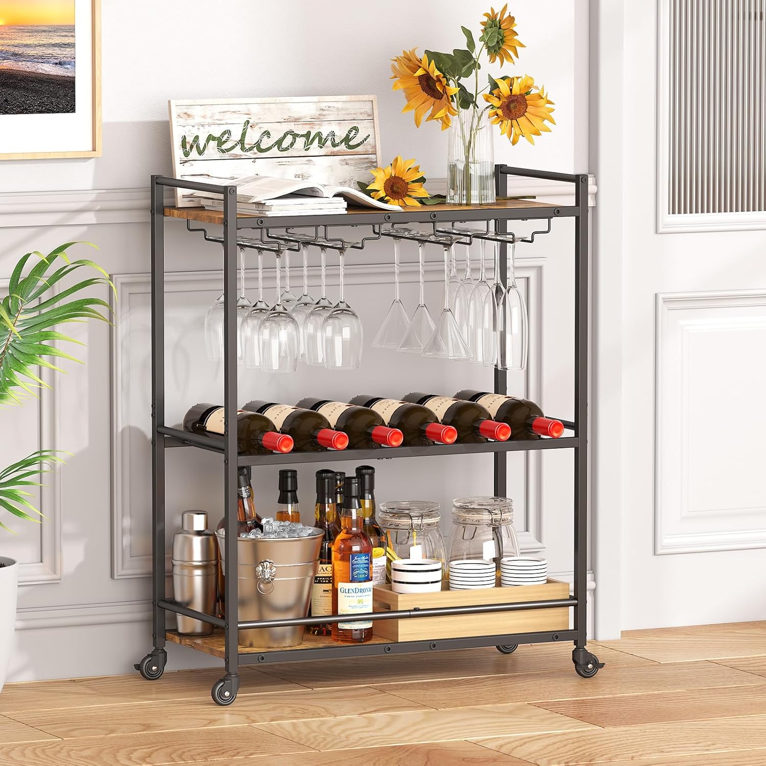 Lifewit Drink Trolley, 3 Tier Bar Cart with Lockable Wheels, Wine Rack and Glass Holders, Serving Cocktail Alcohol Trolley for Kitchen Dining Living Room, 63.2 x 30 x 81.5 cm, Rustic Brown