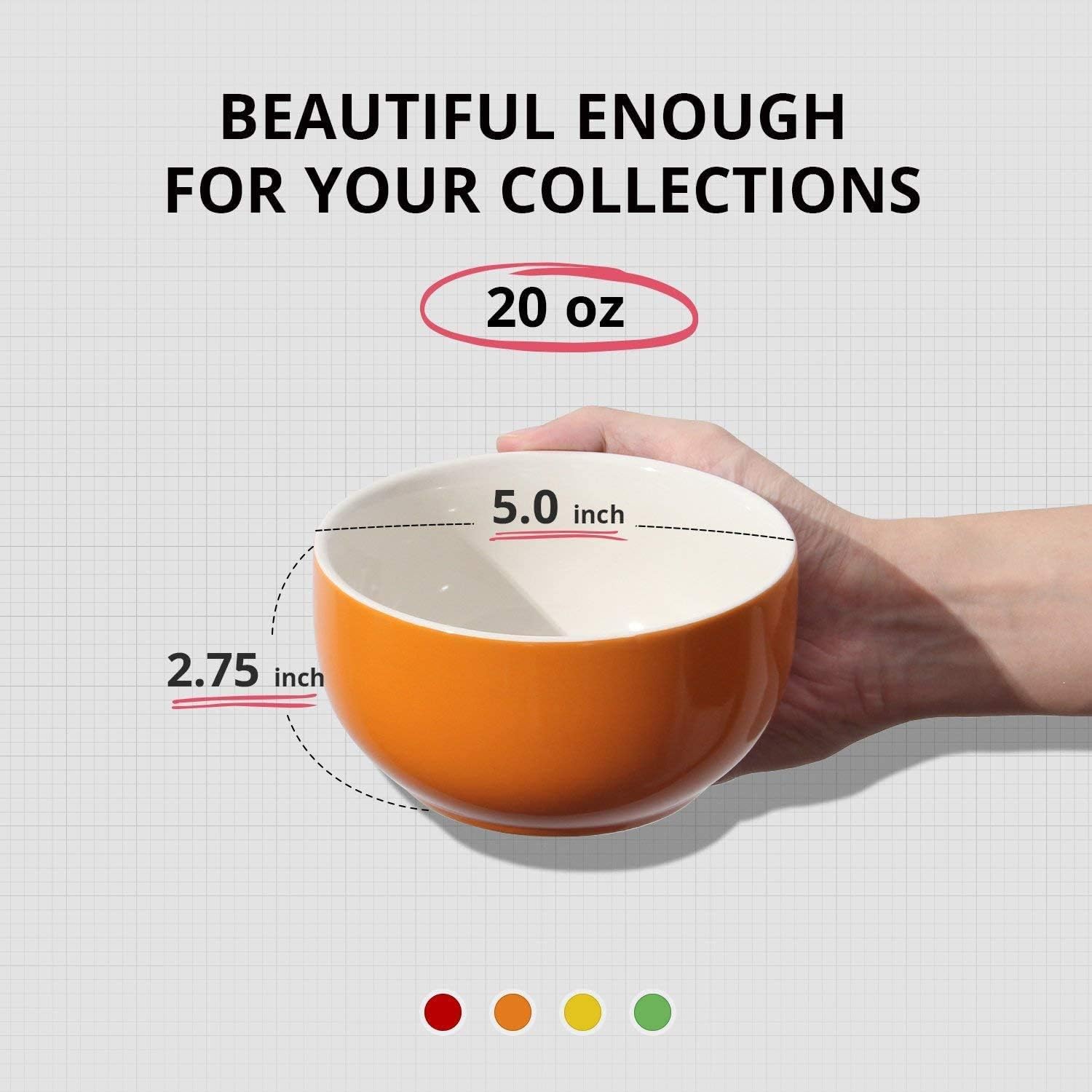 PERFECT SIZE TO PORTION FOOD – A set of 4 deep porcelain soup bowls in Multicolor: yellow, orange, red and green. 12.7 x7cm(5x 2.75 inch), 600 ml(20 oz). These deep cereal bowls especially for children and teenagers
