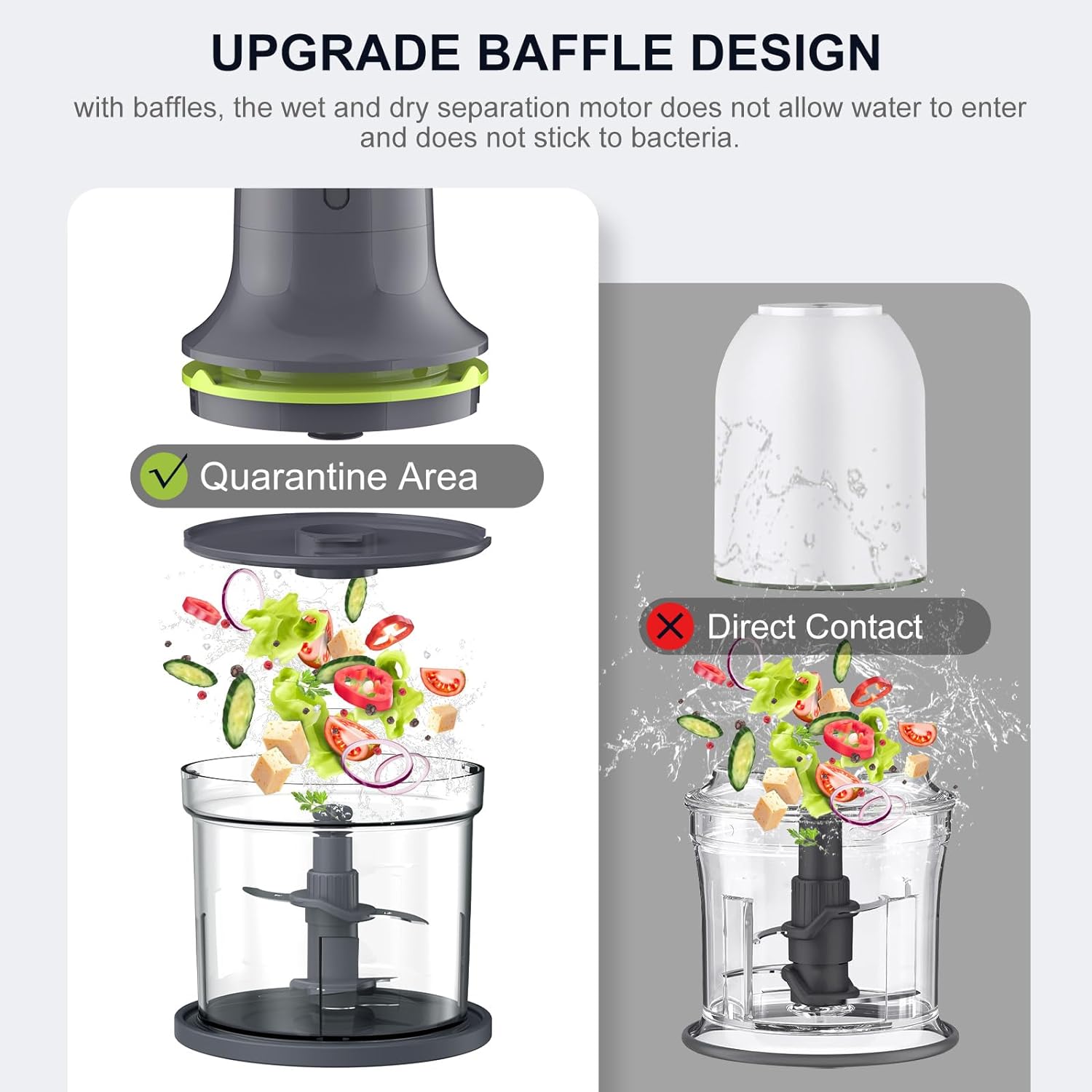 MORE DETAIL OPTIMIZATION: The food chopper has an upgraded short-axis design, which compared to the traditional spring structure, effectively avoids meat stuffing and bacteria breeding; there is an area between the chopper electric motor and the cutting bowl that can accommodate wires, saying goodbye to kitchen clutter. ; upgrade baffle design, food processor with baffles, the wet and dry separation motor does not allow water to enter.