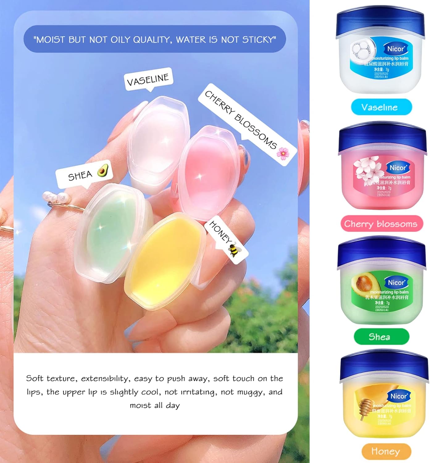 【LIP BALM GIFT SET】This lip balm set contains a original lip balm, a sweet warming honey lip balm, a refreshing Shea butter lip balm and a sweet cherry blossoms lip balm. This is the perfect small gift for teens or adults. Give the gift of lip therapy with four luscious lip butters, subtly scented and clear when applied for a dewy, glossy look. Vegetarian-friendly, too!
