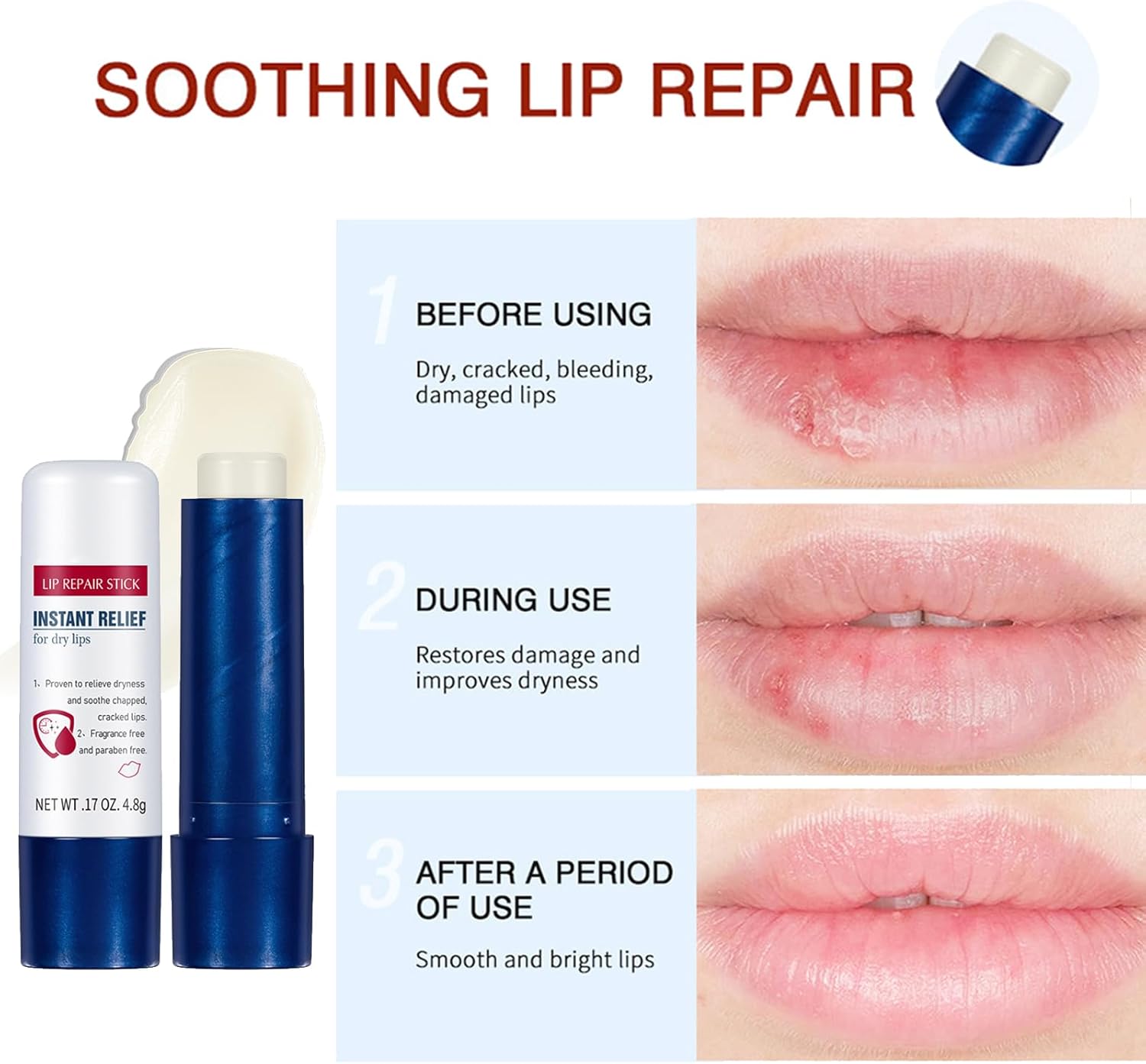 【Hydrates and Soothes】This Lip Repair Stick is nourish and moisturise your lips; provides all day hydration and prevents dried out, sore, chapped lips.Moisturizing Lipstick / Lip Balm, Moist Lips, Prevent Chapped Lips, Healthy and Safe.