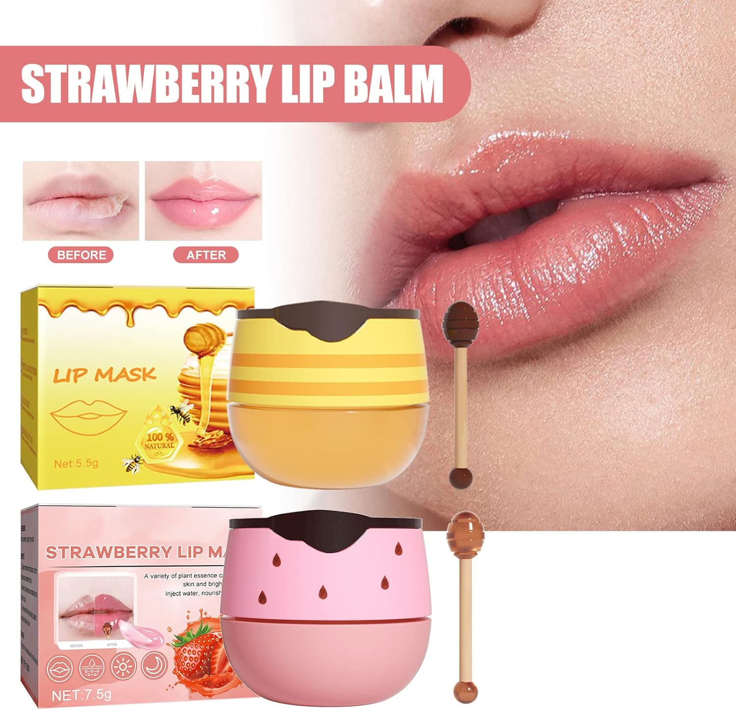 Lip Masks,Strawberry Bee Balm Lip Mask Set,Moisturizing Lip Care With Natural Oils For 24h Moisture Care,Lighten Dark Lip Color Reduce Lip Lines&Wrinkle Lip Repair Protection(2PC)