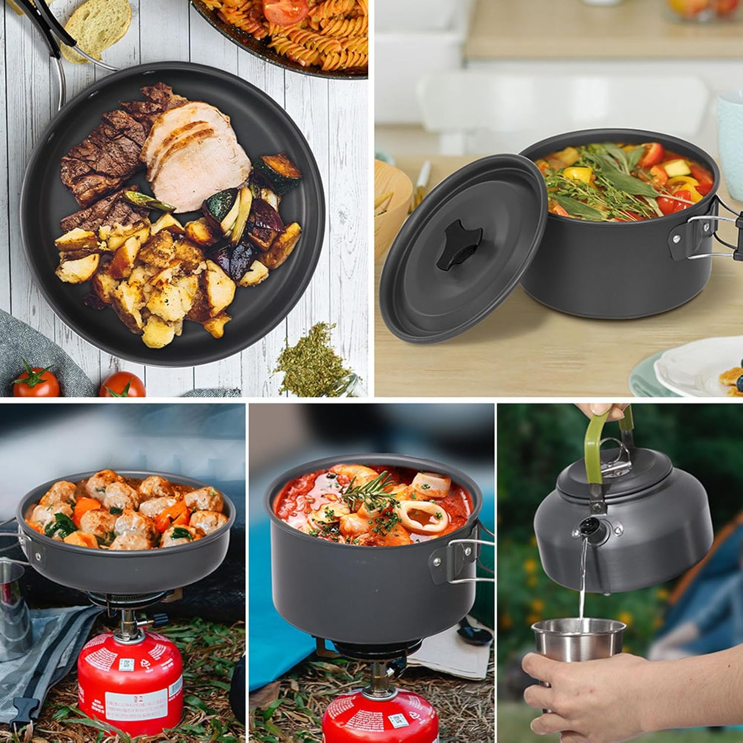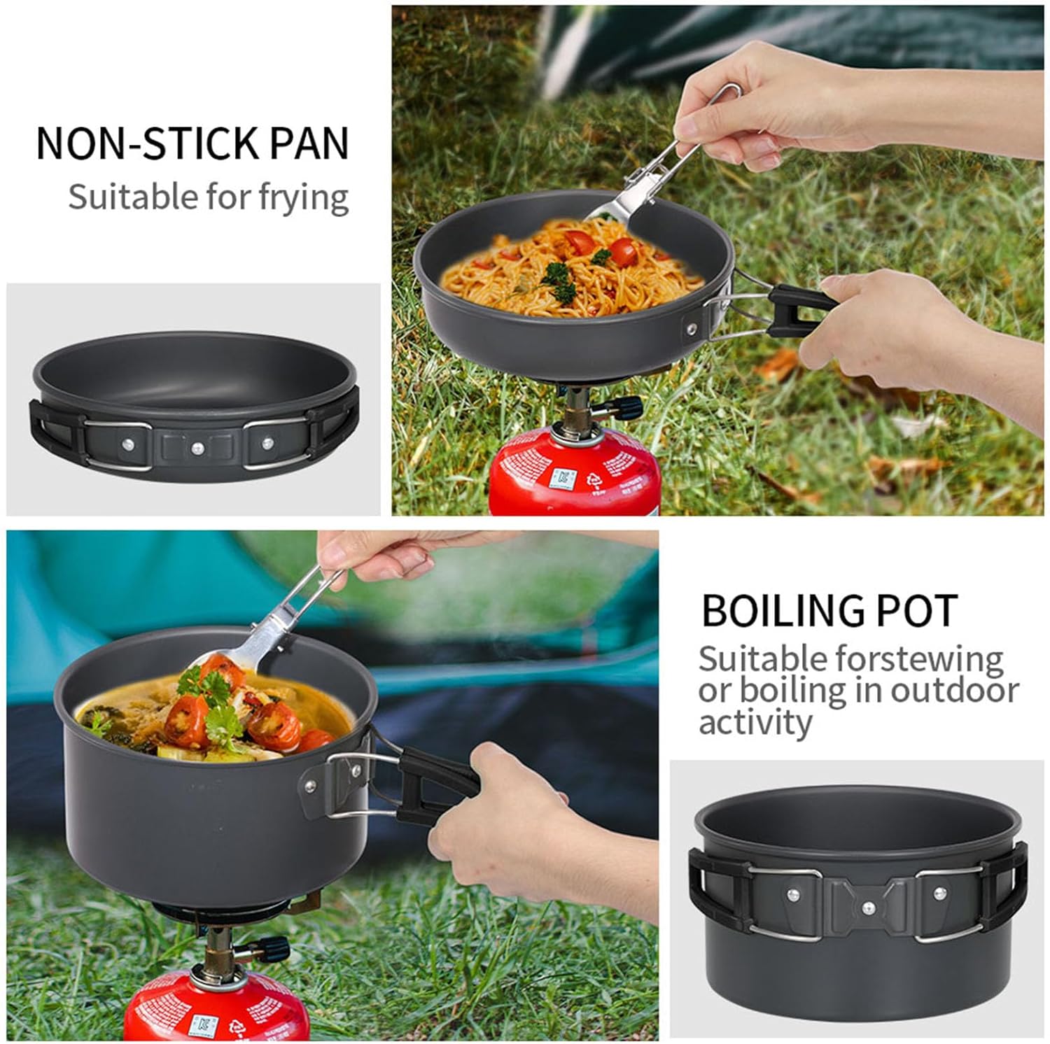 【Premium Quality】This camping cooking set is made of hard-anodized aluminum with non-sticking coating for easy cleaning, durable to use. It conducts heat quickly and is a must-have survival gear that built to last for long time.(Note: Do not use hard objects to scrub the pot to prevent destroying coating, thus won’t stick.)