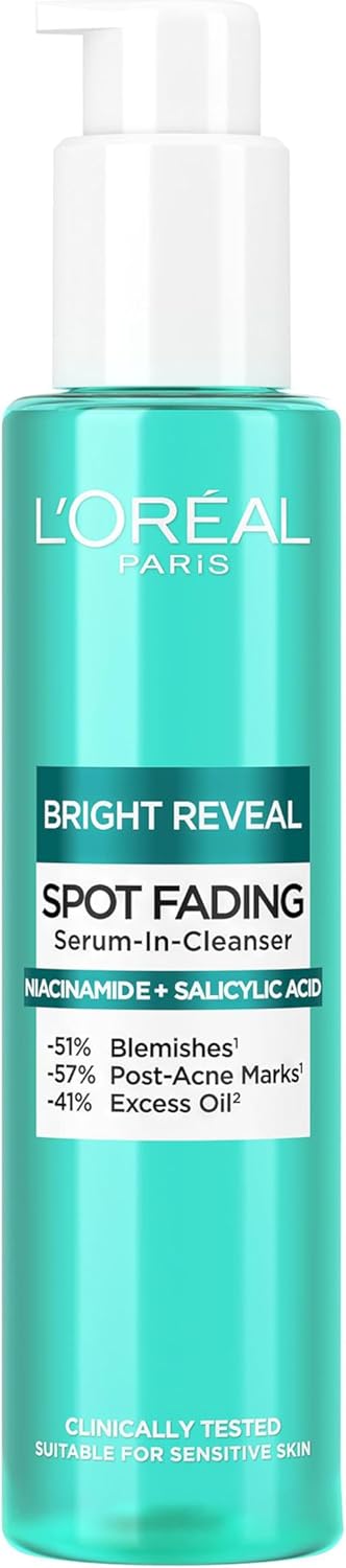 Contents: 1x L’Oréal Paris Bright Reveal Spot Serum-In-Cleanser for Face, Niacinamide and Salicylic Acid, Visibly Fades Blemishes and Post-Acne Marks, Eliminates Excess Oil, 150ml