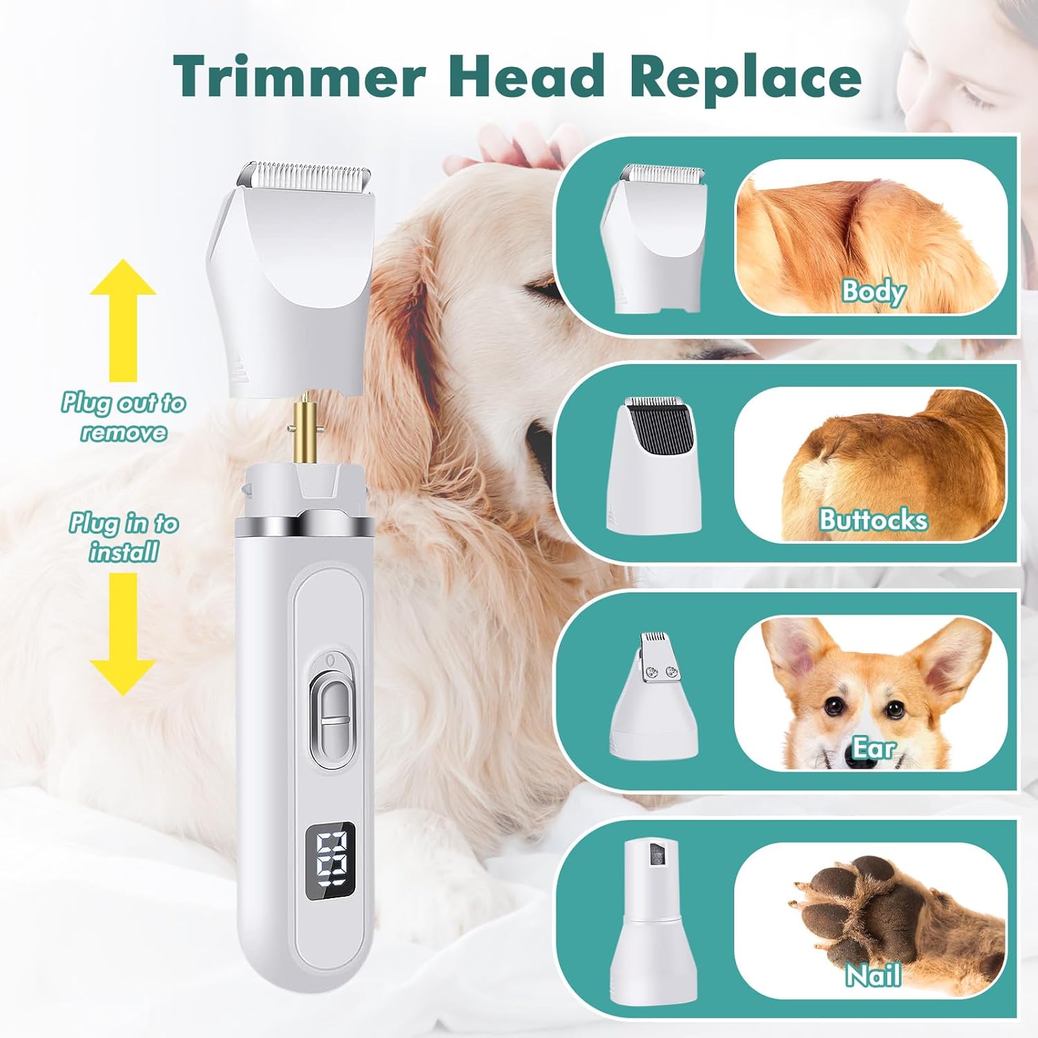 【𝟒 𝐢𝐧 𝟏 𝐃𝐨𝐠 𝐆𝐫𝐨𝐨𝐦𝐢𝐧𝐠 𝐊𝐢𝐭】 Our dog grooming kit are equipped with 3 trimmed heads and 1 nail grinder head. The size of each trim is designed for your dog, cat, or other furry friends. This dog grooming is very suitable for precisely trimming the body, face, feet, and other areas of hair. There is also a need for grinding nails.