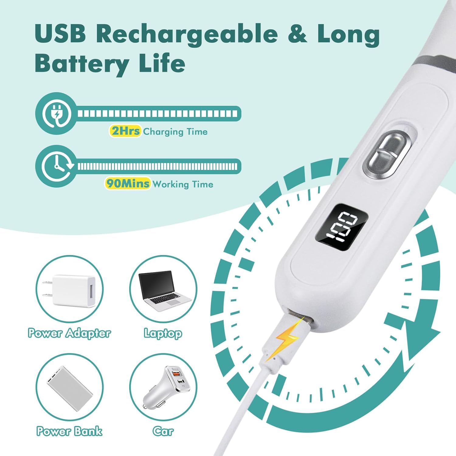 【𝐑𝐞𝐜𝐡𝐚𝐫𝐠𝐞𝐚𝐛𝐥𝐞 𝐃𝐨𝐠 𝐂𝐥𝐢𝐩𝐩𝐞𝐫𝐬 & 𝐋𝐄𝐃 𝐃𝐢𝐬𝐩𝐥𝐚𝐲】Dog clippers cordless supports various USB devices for charging, 1.5 hours of fast charging can provide 90 minutes of working time. The dog clippers with LED Display which you could easily check the power percentage. grooming products for dogs is durable and sustainable, energy saving and money saving.