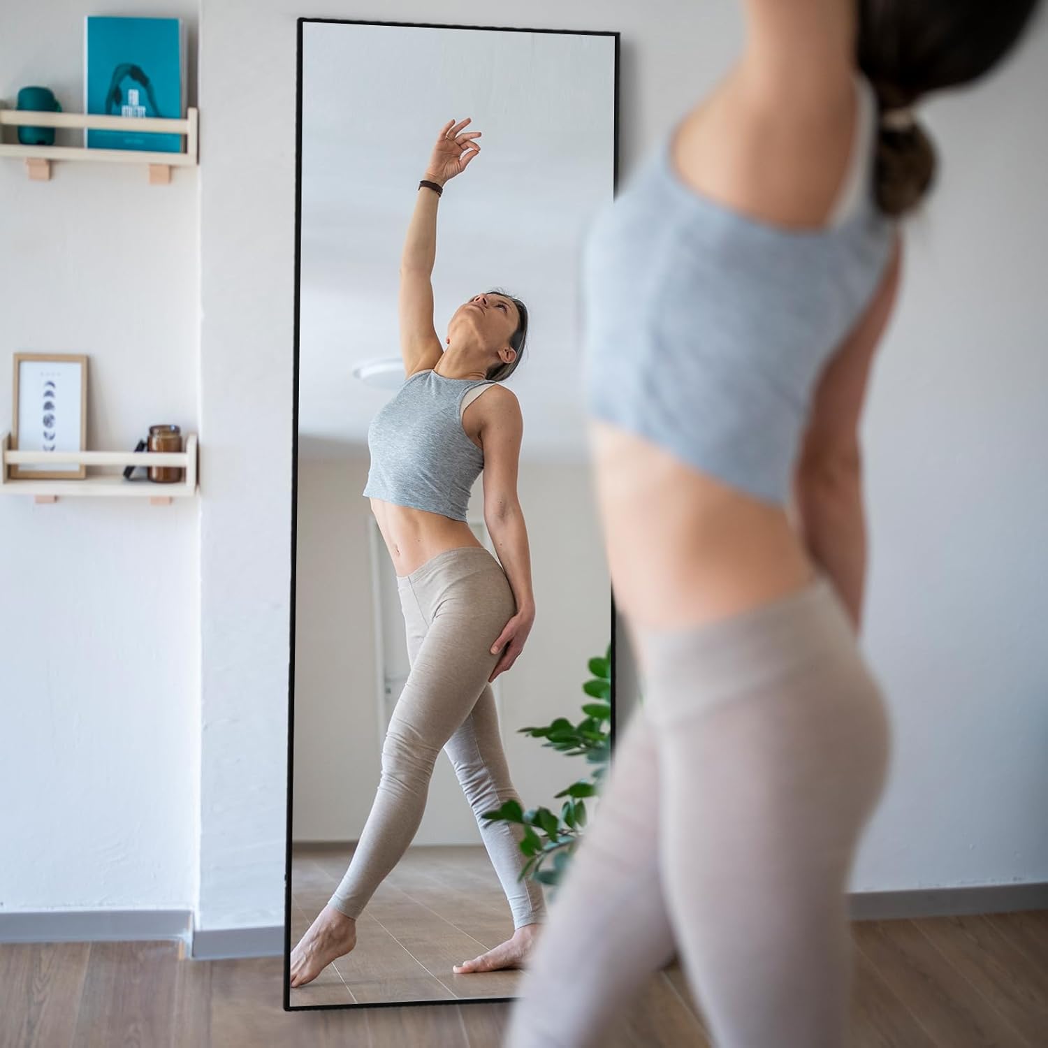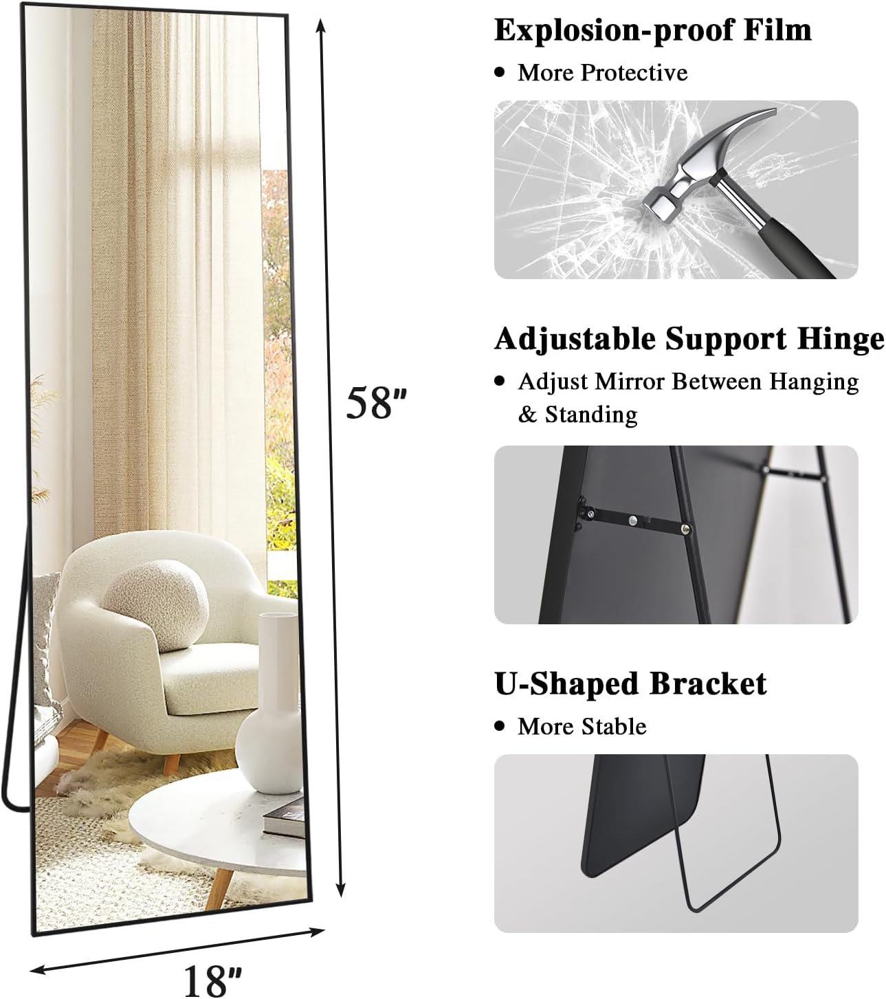 Large Full Length Mirror: 147x44cm(approx.58″ x 18″) full-size floor mirror with stand. Create a wider visual space for you, large and tall enough to check your entire outfit. High definition mirror experience a clear image, reflect your full body beauty with every details