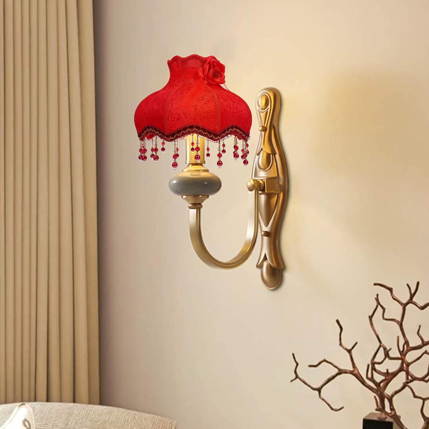 European Style Fabric Lampshade E27 Cloth Lace Lamp Shade with Beads Vintage Chandelier Lamp Shades for Table Wall Lamp Living Room, Red