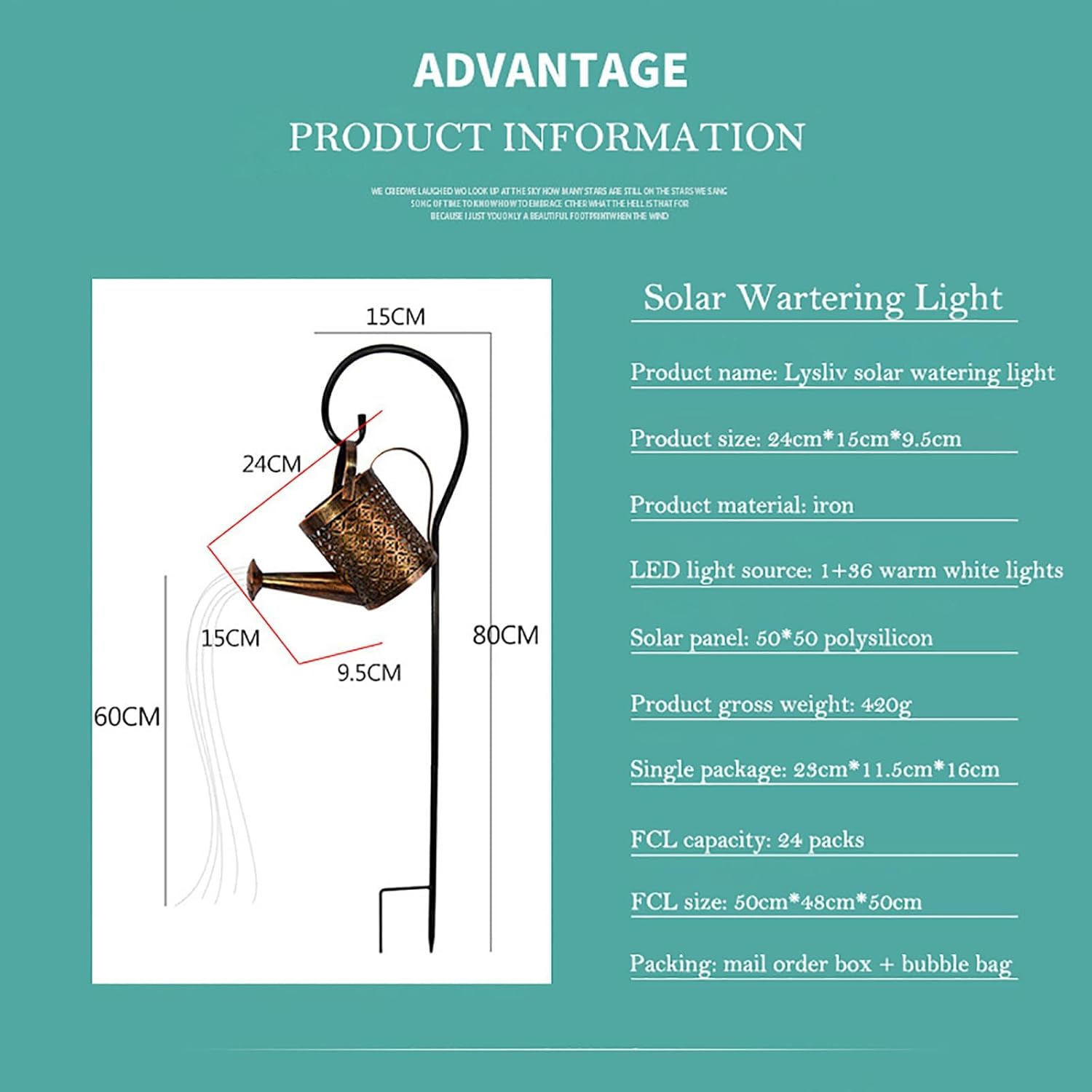 1 x Vintage Style Metal Solar Watering Can 1 x Solar String Lights1 x Shepherd Hook