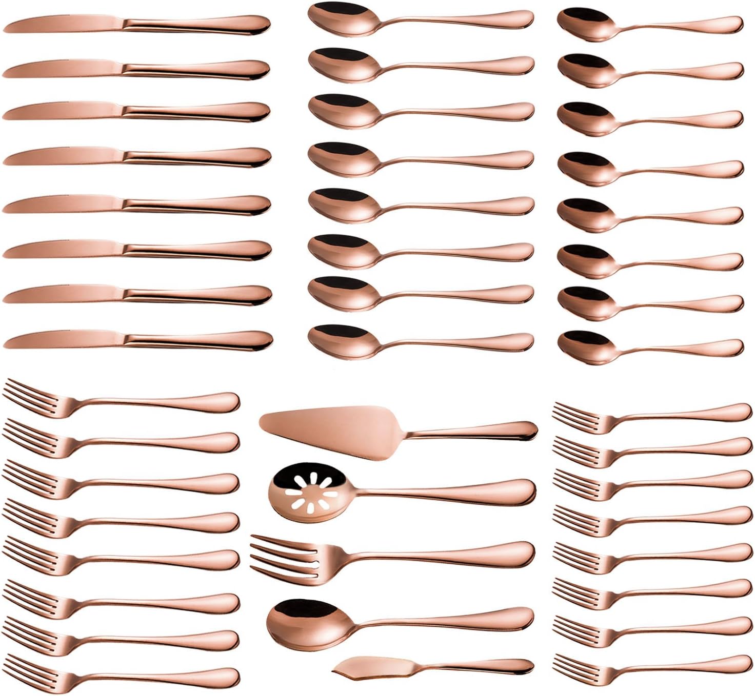 Rose Gold Flatware Set: 8x Dinner Spoon, 8x Dinner Fork ,8x Dinner Knife , 8x Tea spoon 8x salad fork,plus 5-piece serving set: 1 slotted serving spoon, 1 serving spoon, 1 serving fork, 1 cake server, and 1 butter knife