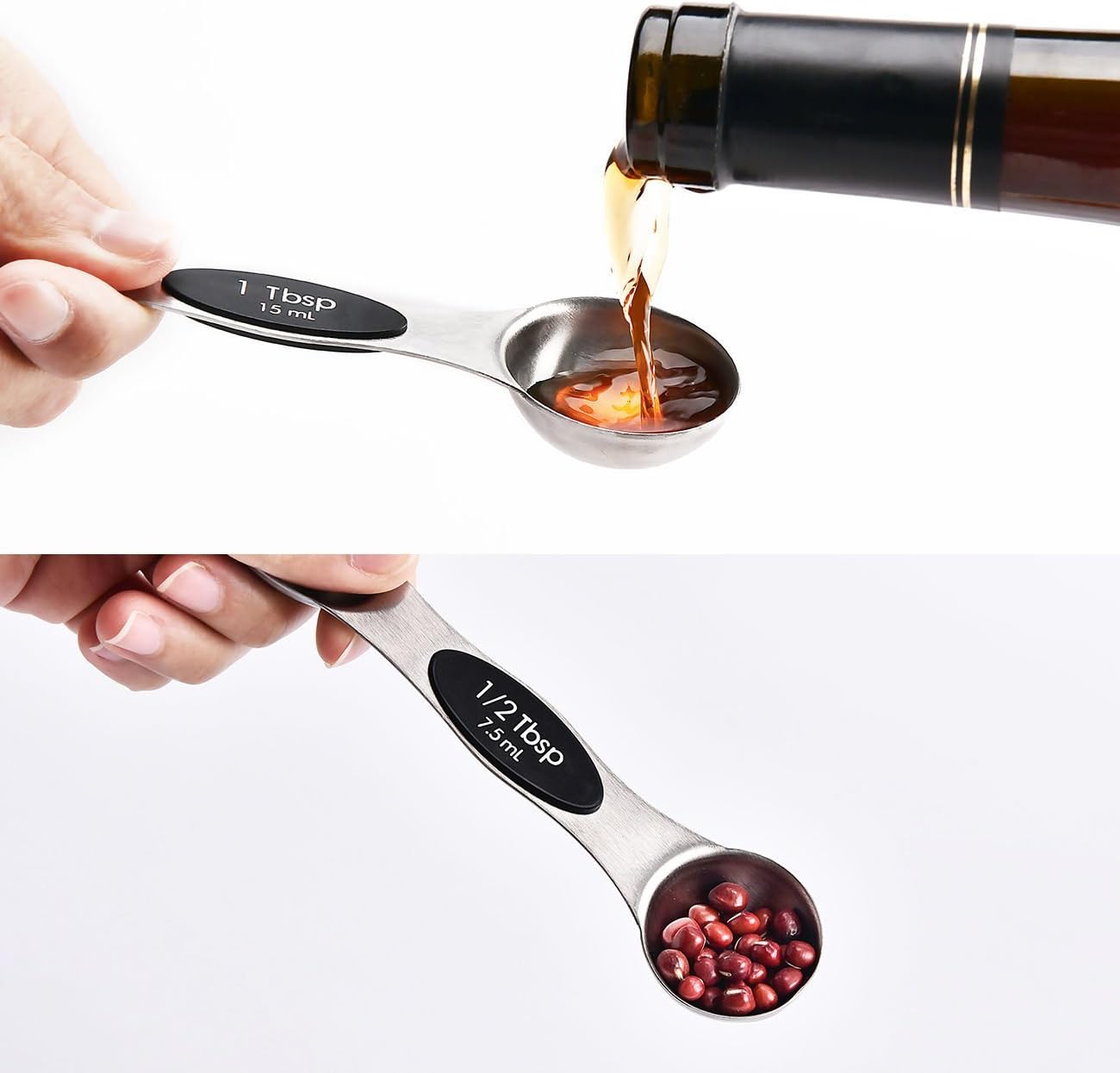 【Double End Spoon Magnetic in Middle】Magnetic in middle of spoon enable each spoon stick together, save space in the drawer and store orderd.Narrow end designed for reaching jar, round end suitable for liquid.