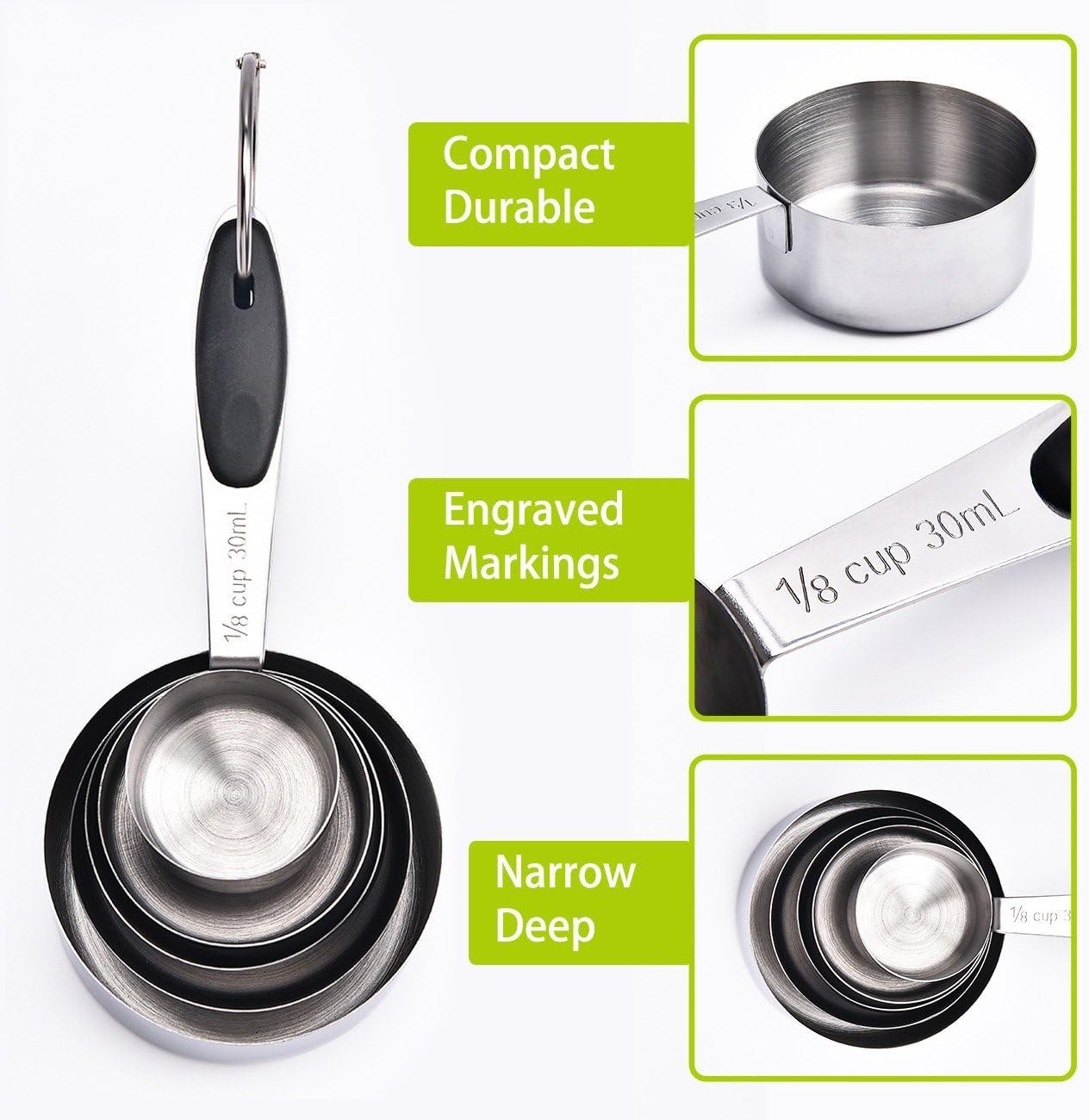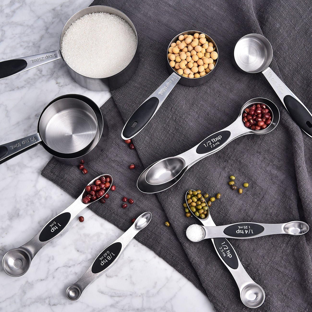 【PERFECT SPOONS/ CUPS FOR ACCRATE MEASURING】Crafted of professional-gauge tablespoons includes 11 measuring sizes: 1/8 tsp, 1/4 tsp, 1/2 tsp, 1 tsp, 1/2 Tbsp, 1-Tbsp, 1/8 cup, 1/4 cup, 1/3 cup, 1/2 cup, 1 cup. With each measurement conveniently marked on the handle of each spoon ensures precise measuring.
