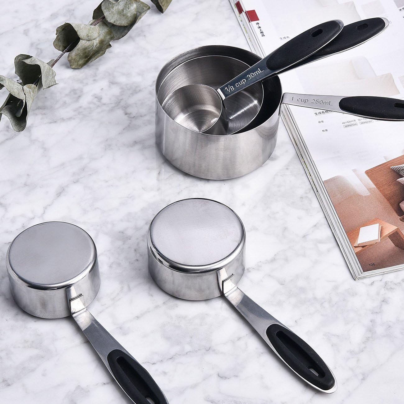 Versatile for American and International Recipes! American (USC) and Metric System Units Included For your American-based recipes, USC are included: 1/8 cup, 1/4 cup, 1/3 cup, 1/2 cup, 1 cup – Measuring Cups 1/8 tsp, 1/4 tsp, 1/2 tsp, 1 tsp, 1/2 Tbsp, 1-Tbsp – Measuring Spoons Metric measurements for your international recipes: including; 30ml, 60ml, 80ml, 125ml, 250ml – Measuring Cups 15ml, 7.5ml, 5ml, 2.5ml, 1.25ml 0.62ml – Measuring Spoons Follow all your favourite recipes to a tee without worrying about imprecise measurements! With laser engraved United States Customary Units (USC), measuring your ingredients will always be precise, accurate and correct. 【1】Accurate Measurements Accurately measure your signature spices with measuring cups and spoon sets! They are Conveniently connected by a small ring which helps to keep the spoons and cups as a set. 【2】Etched Measurement Marks With each measurement conveniently marked on the handle of each spoon and cup, there’s no guess work when adding ingredients. Dishwasher-Safe. 【3】Stainless Steel Construction measuring cups and spoon sets are made of heavy-gauge stainless steel, which means it can stand up to hours of heavy use as you prepare your ingredients. No more guesswork in the kitchen! Accurate Measurements – Every Single Time! This must be the most gift have ever seen since your culinary career, it’s so great to have a stainless spoon. Also a perfect gift idea for friends & family.