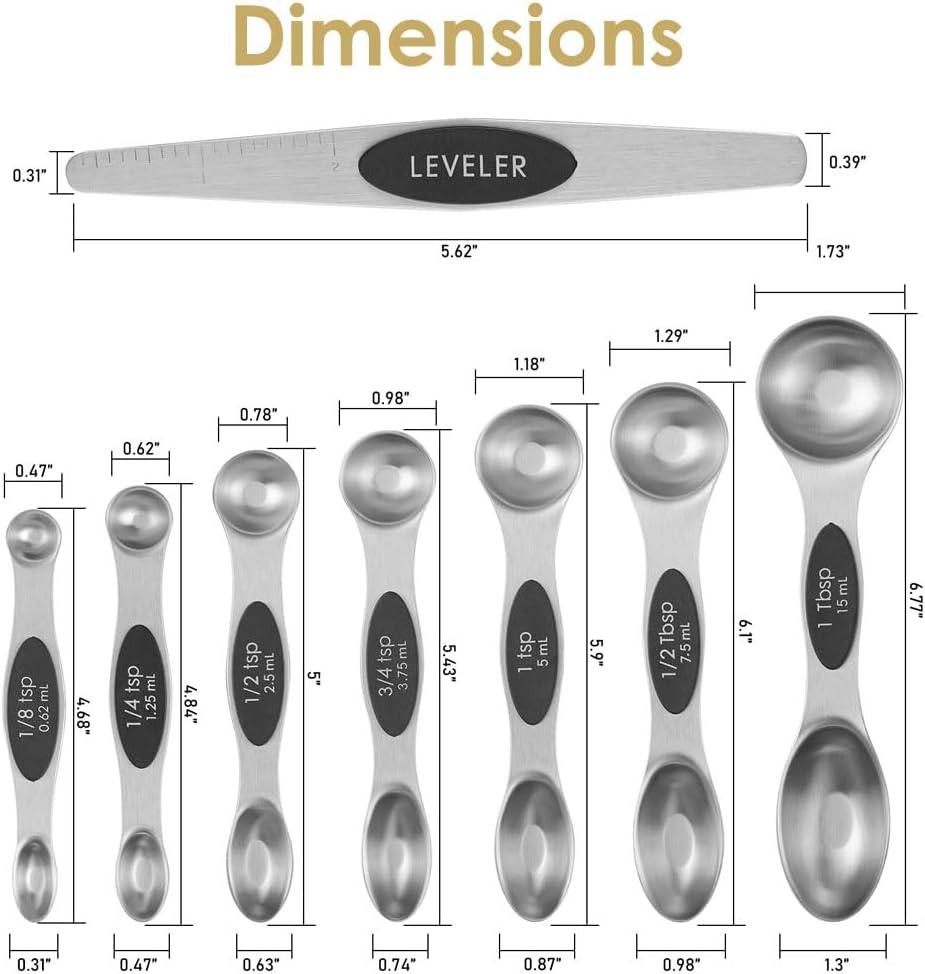 8 PIECES MEASURING SPOONS SET: Including 7 Double Sided Measuring Spoons and 1 Leveler: 1/8 tsp, 1/4 tsp, 1/2 tsp, 3/4 tsp, 1 tsp, 1/2 tbsp, 1 tbsp as well as 1 leveler for removing excess ingredients so that you can cook more accurately and hygienic. The spoon sets make it easy to separate dry and liquid ingredients when measuring. The design also enables you to use it in more scenarios, for baking, cooking, and measuring spices, salt, tea, coffee and oil, etc.