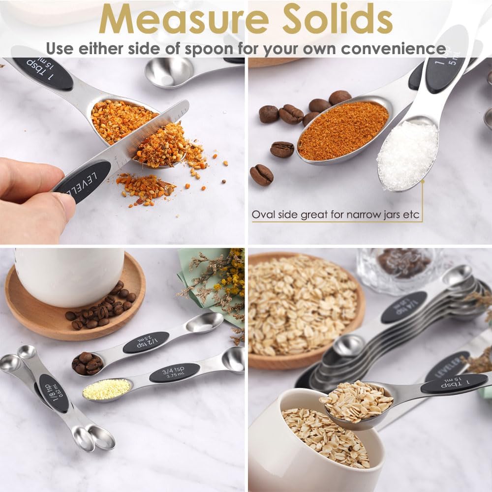Magnetic Measuring Spoons Set of 8, TKNO Dual Sided Stainless Steel Stackable Teaspoon Tablespoon with Scale and Leveler, Fits in Spice Jars for Measuring Dry and Liquid Ingredients