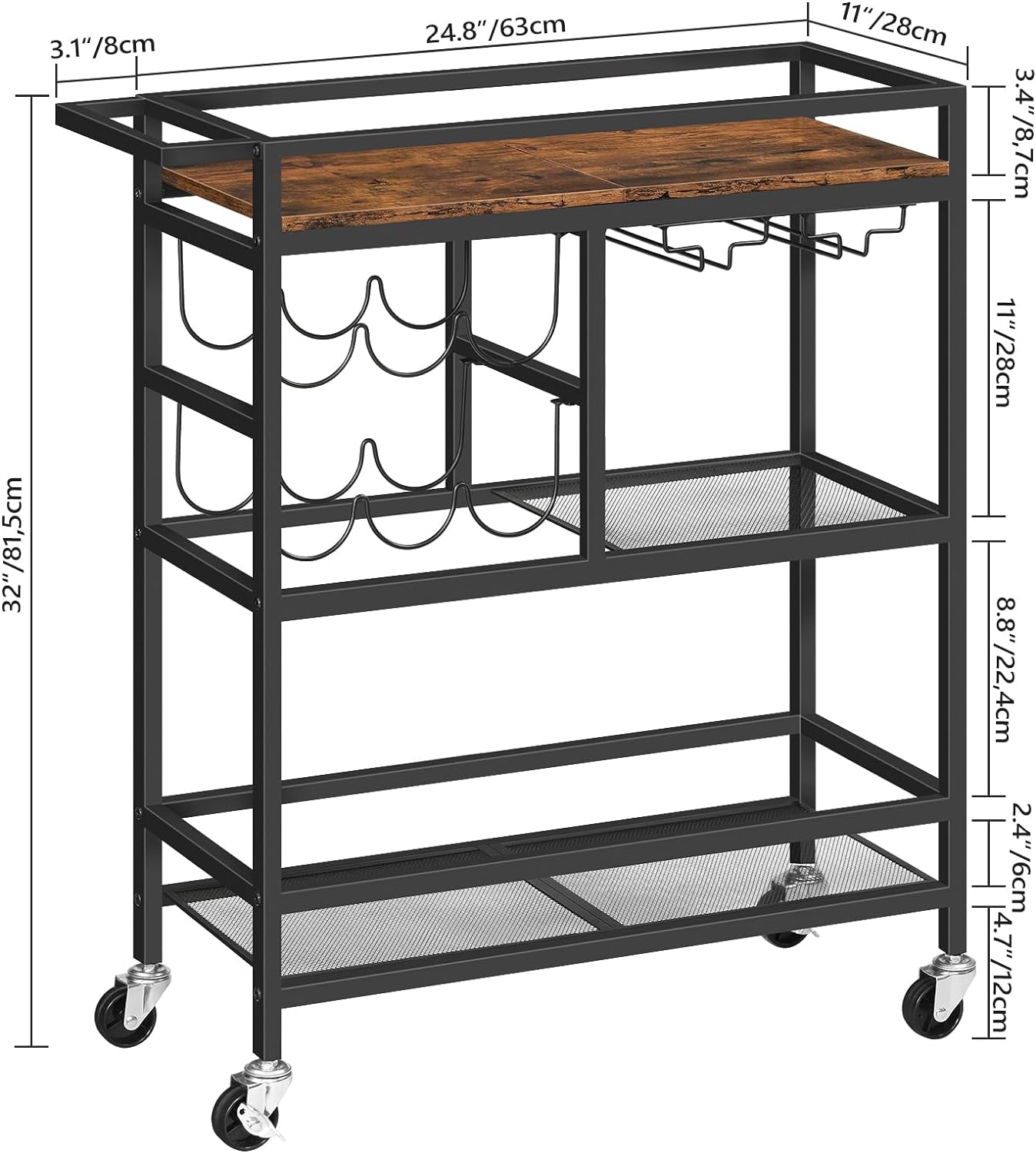 Multi-Level Storage Space: This kitchen serving cart is 63 x 27.9 x 81.3 cm in size, equipped with wine rack and hanging glass holder that can hold at least 6 bottles of wine and 6 goblets. It is an ideal place to store your favorite red wine, champagne and beverage to help you enjoy delicious food with your beloved ones
