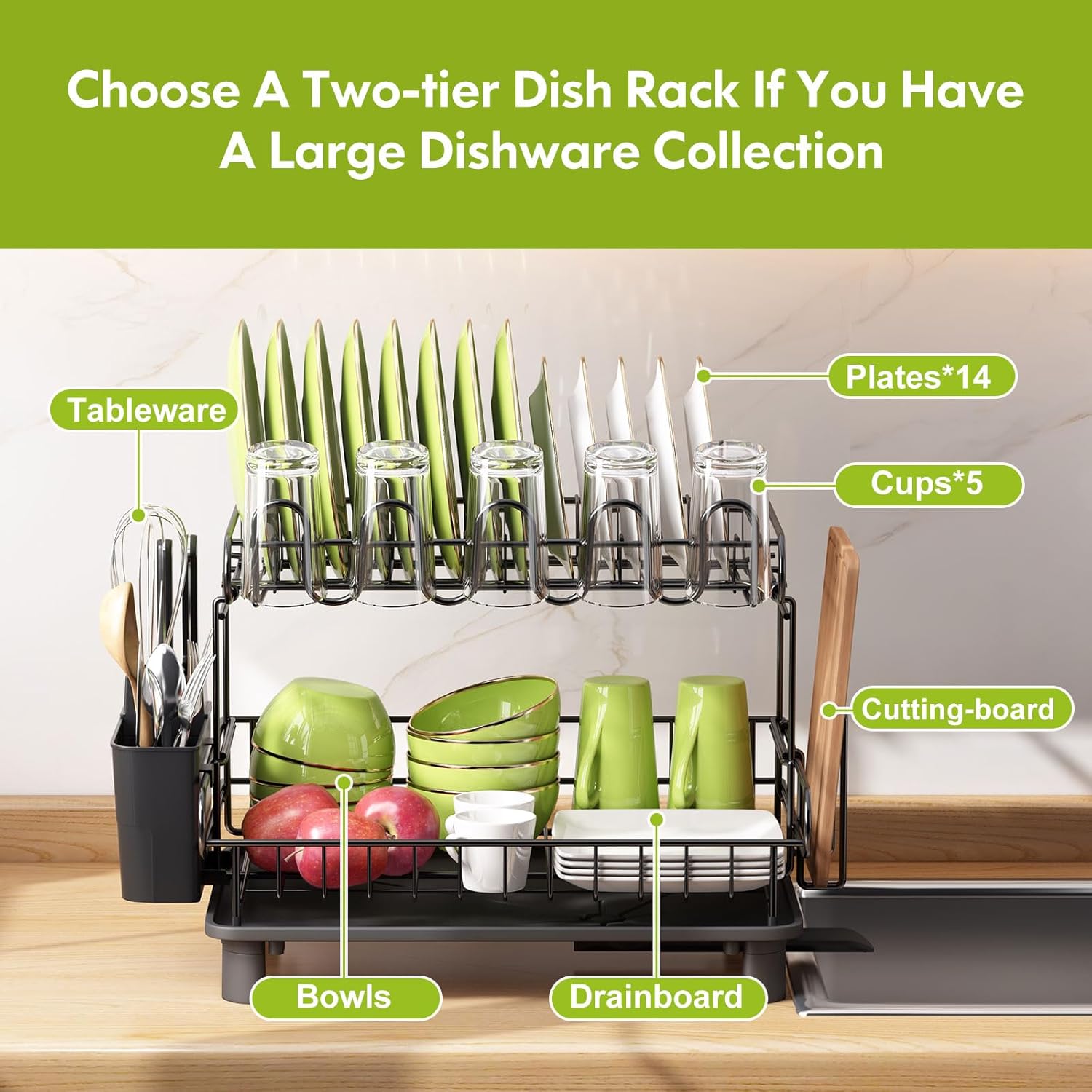 👍80% Space Saver: New Upgraded Large Capacity 2-tier dish drying rack. The top layer can store up to 11 pcs plates, and the bottom layer can hold more than 18 bowls, 6 coffee cups, pots and pans. the side cutlery rack can hold knives and utensils, and the other side can store cutting boards. A really big draining rack makes our Kitchen Counter cleaner and neat!